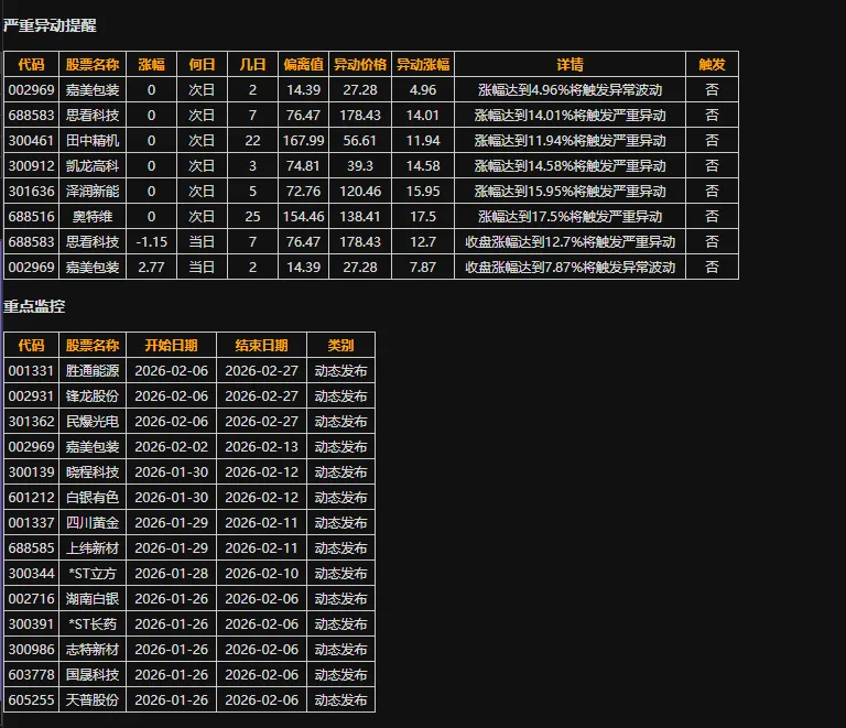 重点监控:严重异动股票提醒,重点监控股票提醒