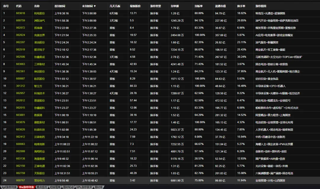 涨停打板列表:表头可排序,实时显示,显示涨停原因和板块,帮助短线选手快速锁定当日热点方向。