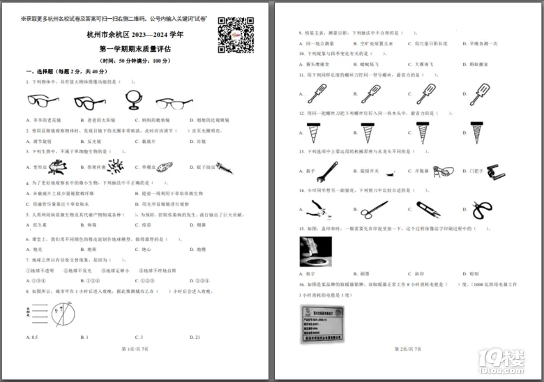 免费领取!余杭区六年级期末科学试卷,可下载打印 | 分享