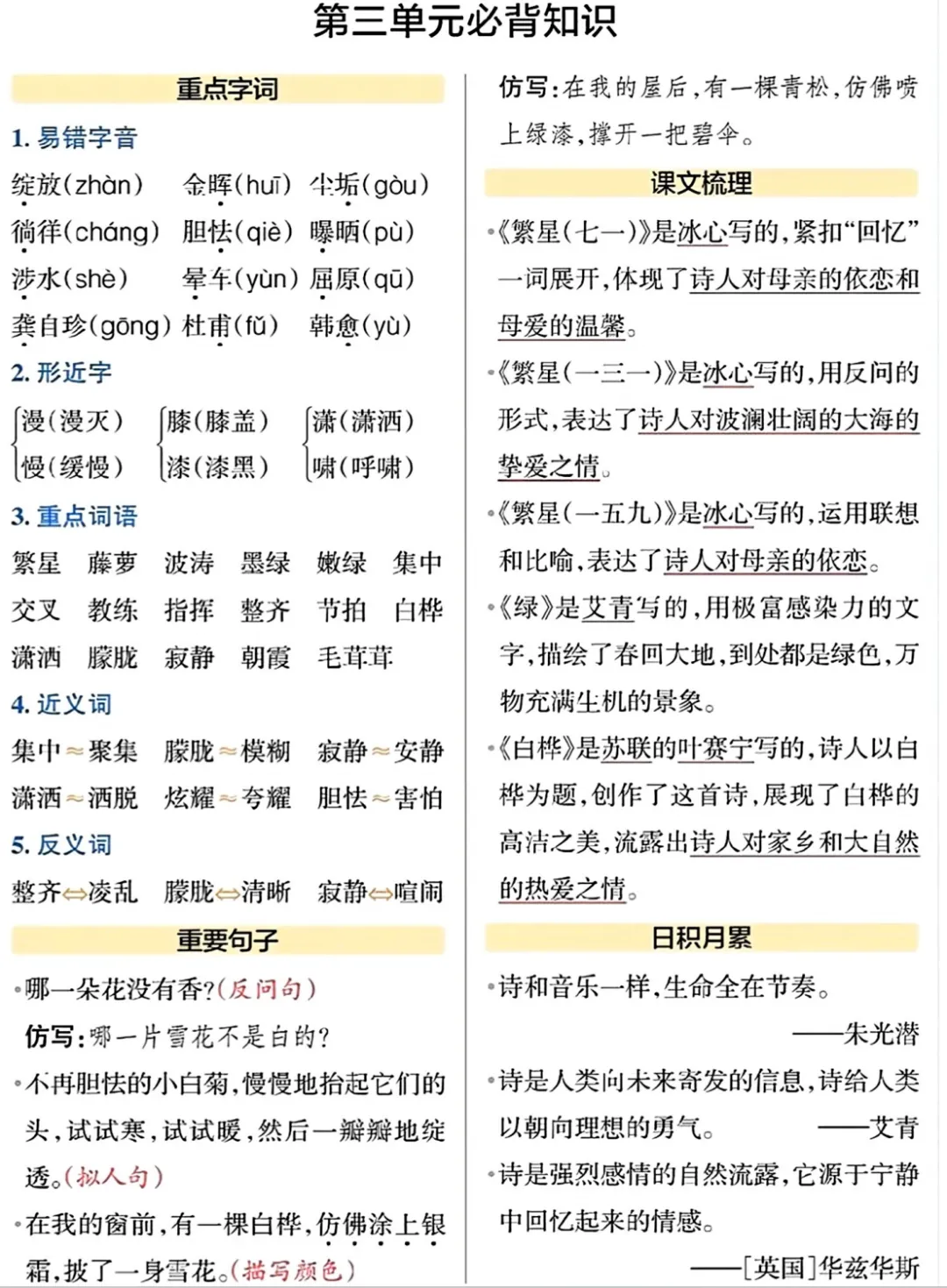 四年级(下册)语文单元必备知识汇总-可打印 大家好,我是你们的老朋友学易通。 2026年的寒假即将结束,四年级的小朋友们马上要迎来下学期的课程了。今天给大家分享一份四年级语文下册单元必备知识汇总,希望能帮助到四年级小朋友提前了解学习内容,一起看内容: 因为篇幅问题,今天的分享就到这里了,有想要完整资料的朋友可以菜单资料库自取或者点击下方卡片。关注我,每天带给你不一样的学习资料~ (ps:在小程序中通过签到和分享可以获得积分哦!)