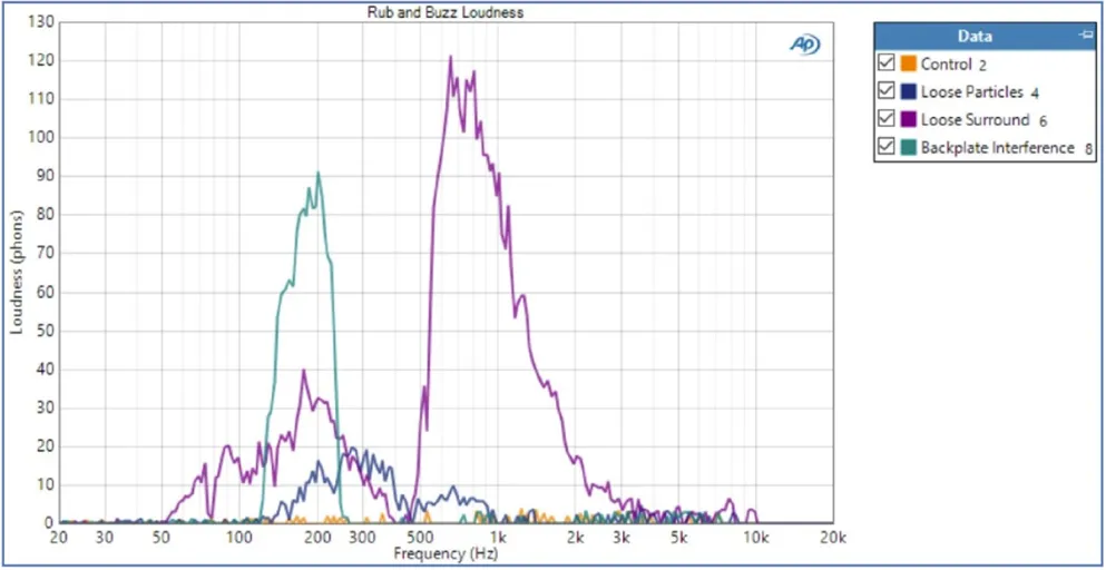 图12.显示了从一台小型全音域扬声器的四份样品中测得的异音响度结果——其中一份样品不存在缺陷(对照样品),而其他三份样品具有以下缺陷(按照严重程度排列):