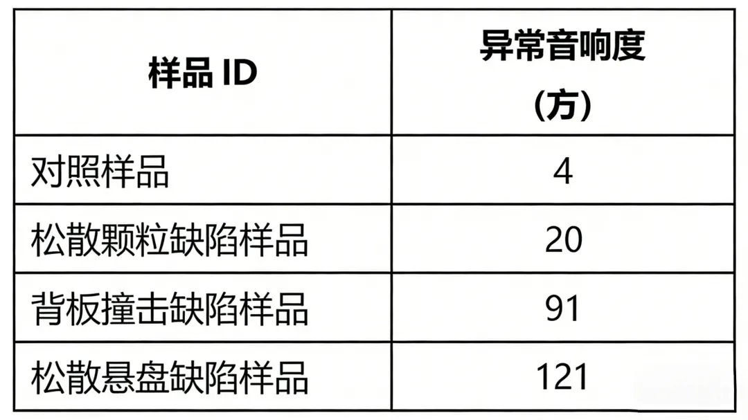 在剩余样品中,异音响度结果似乎均与听者在房间内感知到的响度一致:当扫频通过 200 至 500 Hz范围时,从松散颗粒缺陷样品中可听到轻微的嗡嗡声;当扫频通过 150 至 250 Hz范围时,从背板干扰缺陷样品中可听到更大的嗡嗡声;从松散悬边缺陷样品中听到极大的嗡嗡声,特别是当扫频过渡至 500 Hz至 1.5 kHz范围时。