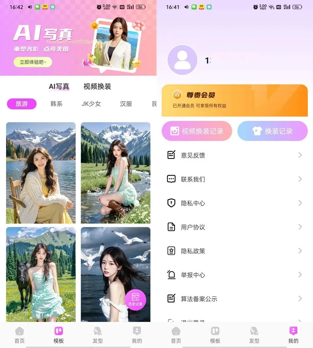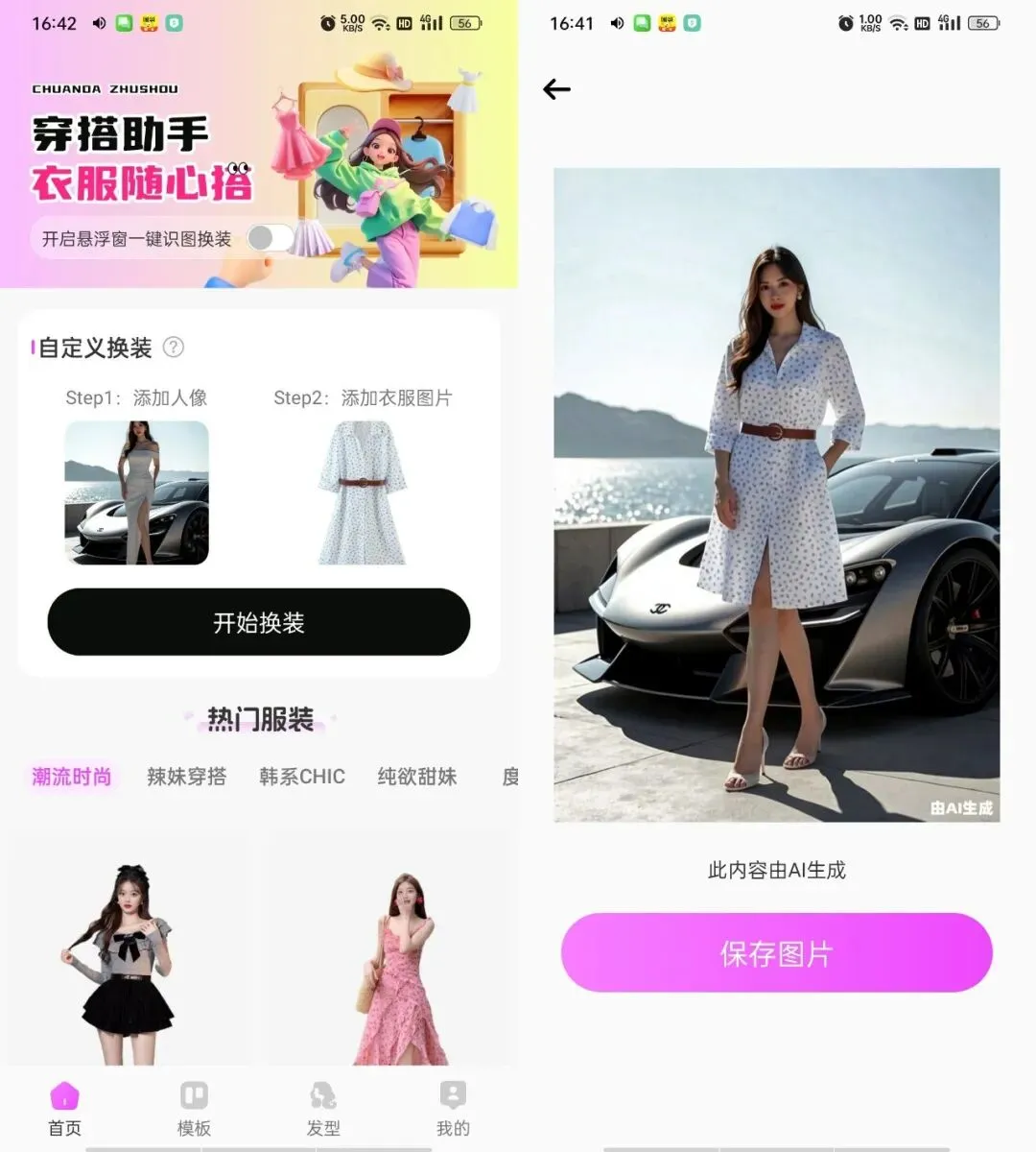 **简介:(生成的图片在,我的–换装记录,里查看) 这是一款AI虚拟试衣与换装工具。用户只需上传自己的照片和衣服的照片,AI即可自动完成换装,并展示多角度的3D效果图。同时支持发型更换、多风格切换(如古风、婚纱、学生装等)以及海量服装素材库的自由搭配,帮助用户轻松尝试不同造型。