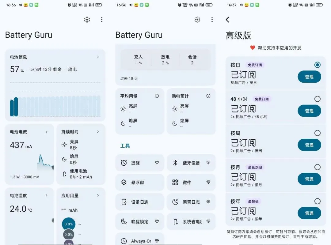 **简介:** BatteryGuru是一款专业的电池健康监测与管理工具。它可以实时监测电池温度、健康度、实际容量和充电功率,提供详细的充电统计和使用数据分析。应用支持设置电池充满提醒、高温报警等自定义通知,并提供桌面小部件,帮助用户更好地了解并延长电池寿命。
