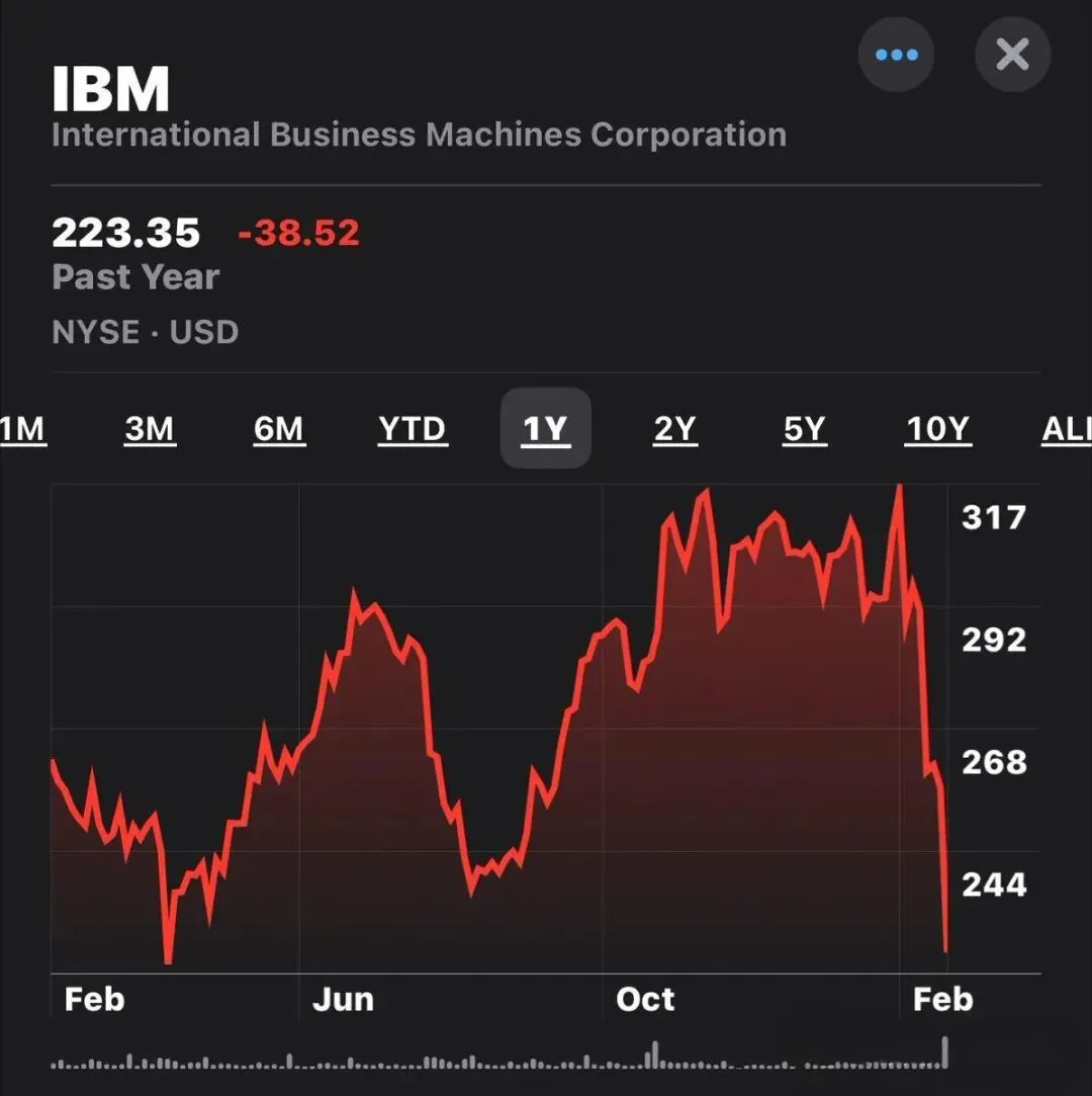 当天Anthropic发布高效COBOL现代化工具,此AI能取代庞大外部咨询师团队,致IBM自2000年以来单日最惨暴跌,一天狂跌13%,2月累计跌幅达27%。