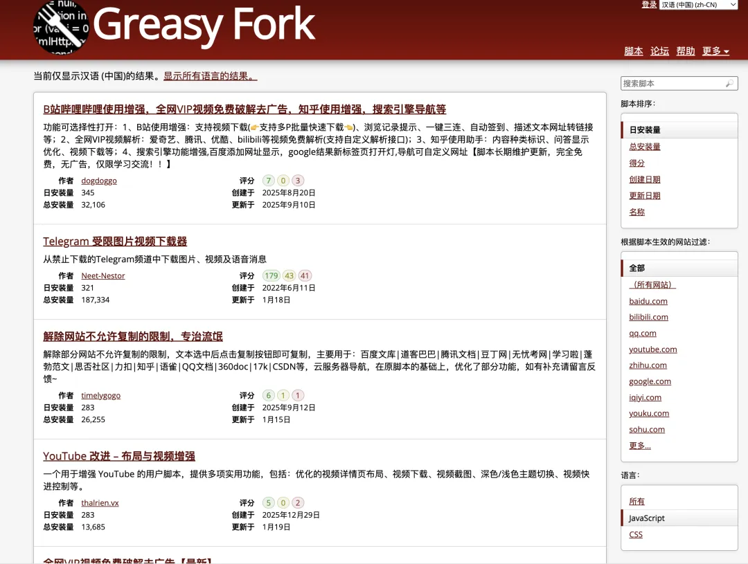 GreasyFork 脚本站(https://greasyfork.org/zh-CN/scripts) -