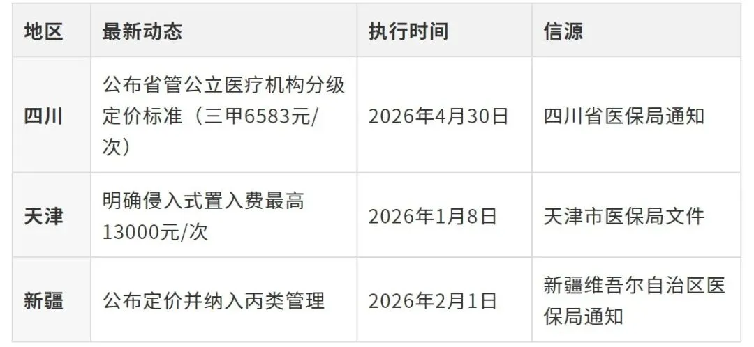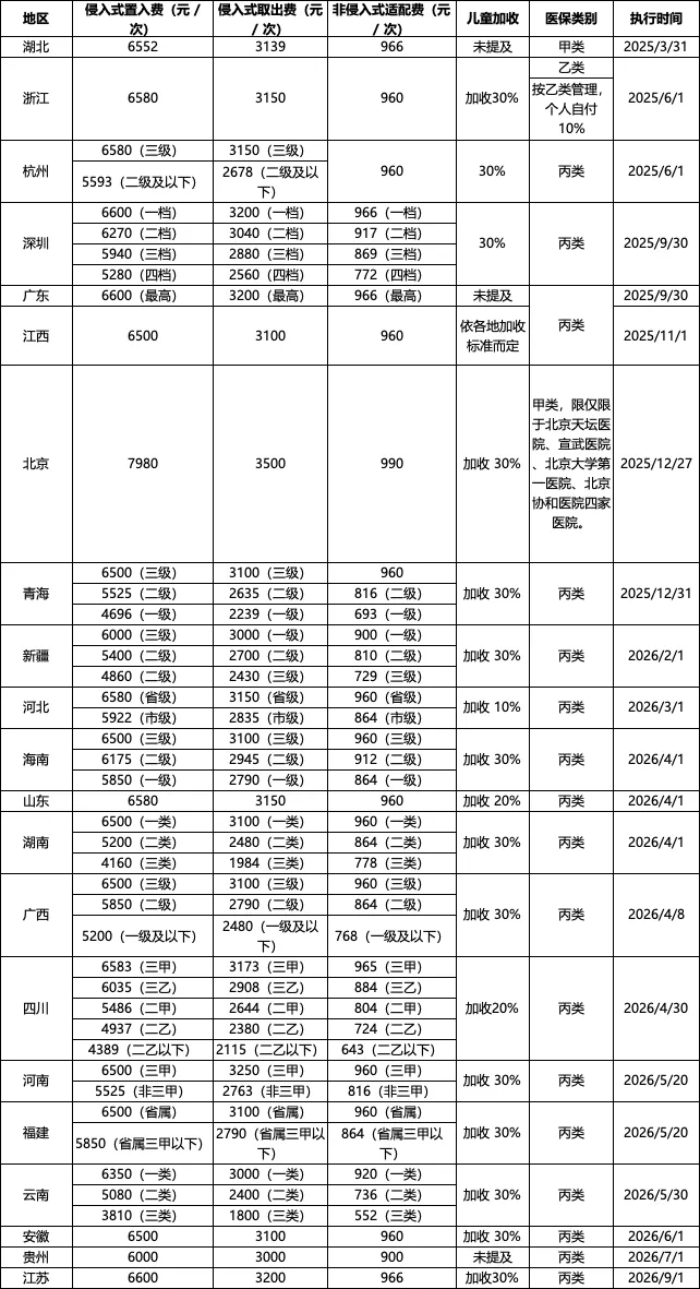 • 定价趋同:侵入式置入费多在6500-6600元,取出费在3100-3200元,非侵入式适配费在960-966元 。这表明各地充分参考了国家医保局框架,体现了对技术价值的共识。