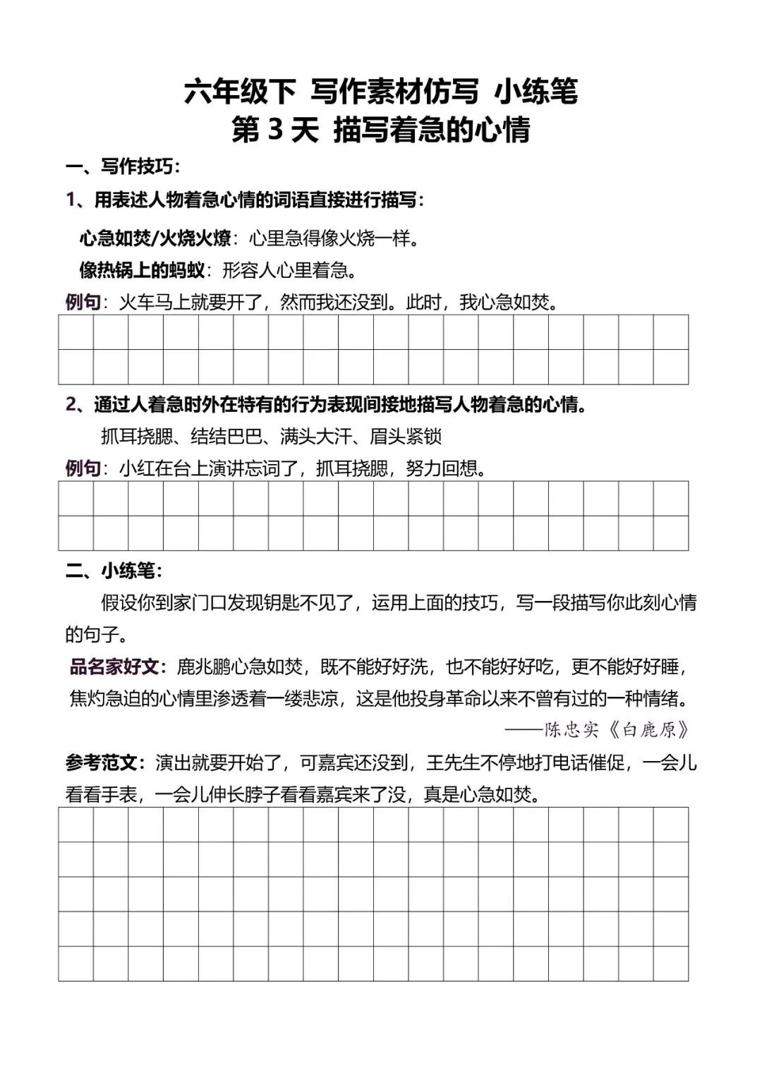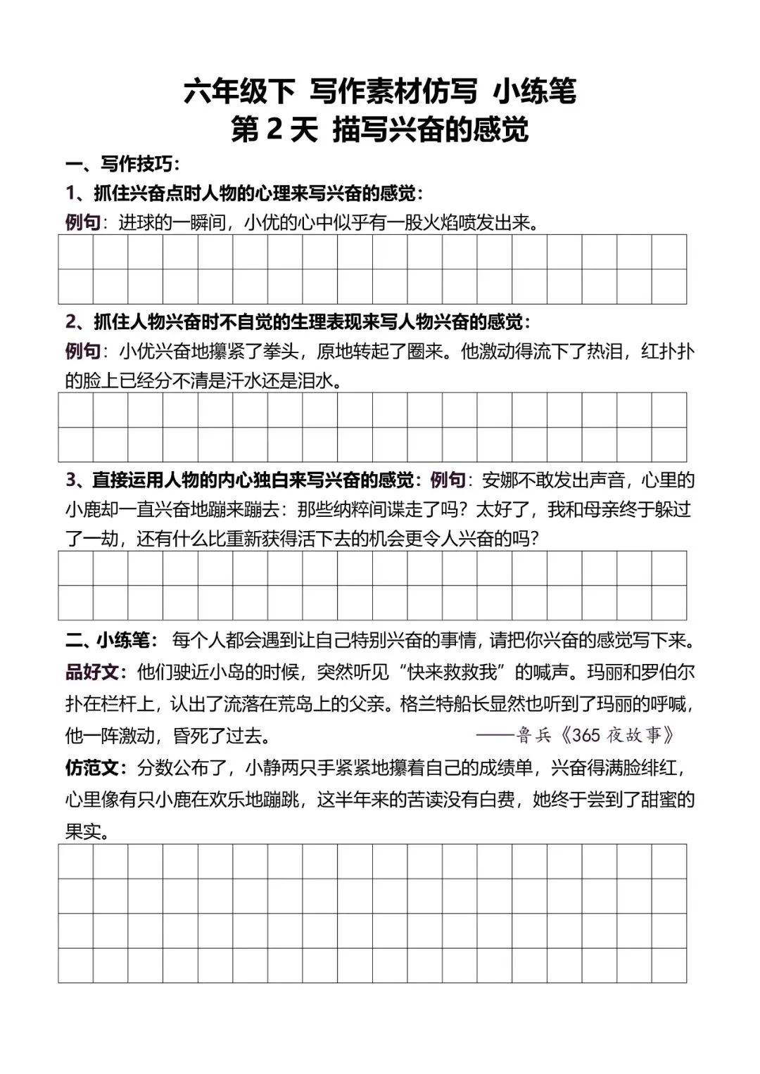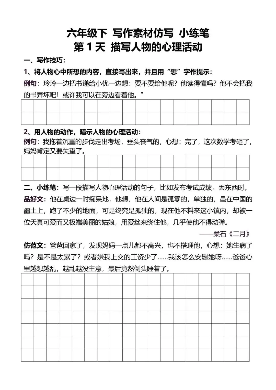 统编版语文六年级下册《好文仿写小练笔》,可下载打印 今天,小编给大家带来了统编版语文1-6年级(下)各类预习资料。大家可以根据自己的喜好自行选择、打印。让孩子多多预习,多多练习,为学习的进步,打下一个坚实的基础。欢迎大家分享+下载+收藏哦~ 小学语文资料 完整版请拉底回复 点击图片,查看大图 ▼▼▼▼ 篇幅有限,仅展示部分图片 点击阅读原文也可领取 点击“阅读原文” 领取完整电子版