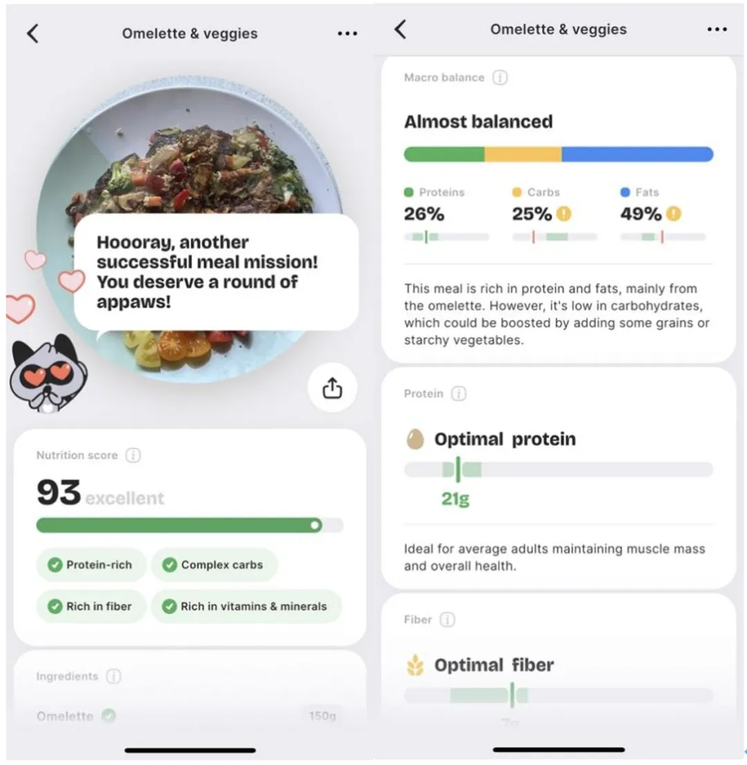 数据管理作为卡路里追踪工具最核心的功能,「BitePal」也没有放弃,但完全改变了呈现逻辑。从订阅用户的反馈中可以看到,记录一顿饭后,首先看到的不是卡路里数字,而是营养评分。这个评分主要考量的是各种营养素的均衡程度,本餐亮点还被特意地 Highlight 出来,更详细的营养数据和改进建议附在后面供有需要的用户查看。