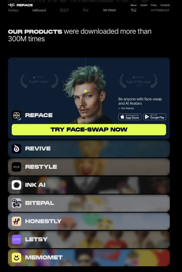 为了摆脱这种“一次性趣味”的局限,Reface 在两年前果断调整战略, 从单一应用转型为多产品矩阵。整体思路还是利用此前「Reface」在计算机视觉和 AI 领域的积累,重点在图像、视频相关领域展开探索,官网信息显示,目前 Reface 旗下共有 8 款应用 , 探索了 AI 视频(Reface、Revive、Restyle)、图像(Ink AI、Letsy)、健康识别(BitePal)、心理(Honestly)等不同领域。