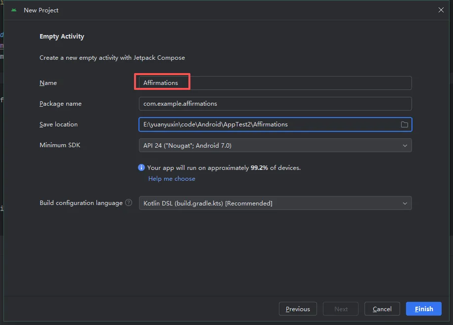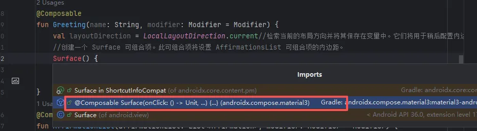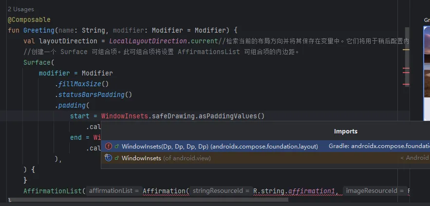 @ComposablefunGreeting(name: String, modifier: Modifier = Modifier) {val layoutDirection = LocalLayoutDirection.current//检索当前的布局方向并将其保存在变量中。它们将用于稍后配置内边距//创建一个 Surface 可组合项。此可组合项将设置 AffirmationsList 可组合项的内边距。Surface(modifier = Modifier.fillMaxSize().statusBarsPadding().padding(//将 LayoutDirection 对象转换为内边距start = WindowInsets.safeDrawing.asPaddingValues().calculateStartPadding(layoutDirection),end = WindowInsets.safeDrawing.asPaddingValues().calculateEndPadding(layoutDirection),),) {AffirmationList(affirmationList = Datasource().loadAffirmations(),//调用资源)}}