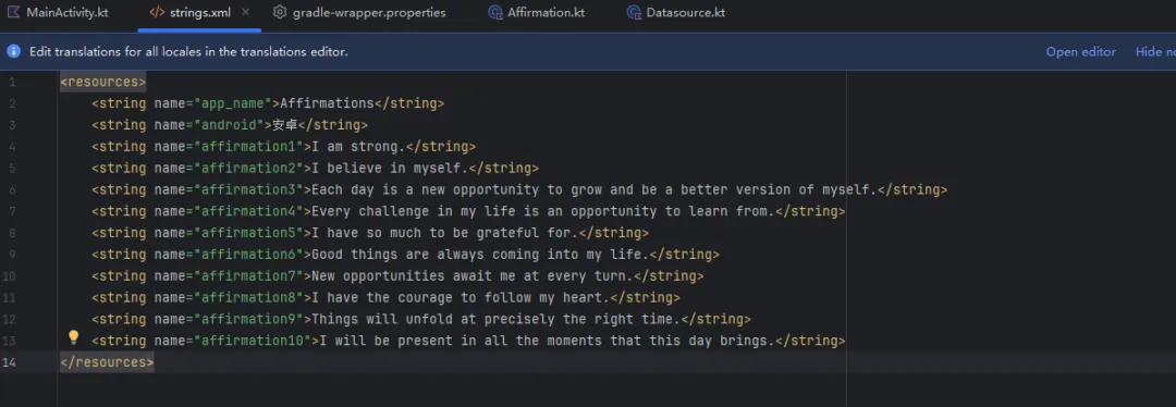 <string name="affirmation1">I am strong.</string><stringname="affirmation2">I believe in myself.</string><stringname="affirmation3">Each day is a new opportunity to grow and be a better version of myself.</string><stringname="affirmation4">Every challenge in my life is an opportunity to learn from.</string><stringname="affirmation5">I have so much to be grateful for.</string><stringname="affirmation6">Good things are always coming into my life.</string><stringname="affirmation7">New opportunities await me at every turn.</string><stringname="affirmation8">I have the courage to follow my heart.</string><stringname="affirmation9">Things will unfold at precisely the right time.</string><stringname="affirmation10">I will be present in all the moments that this day brings.</string>
