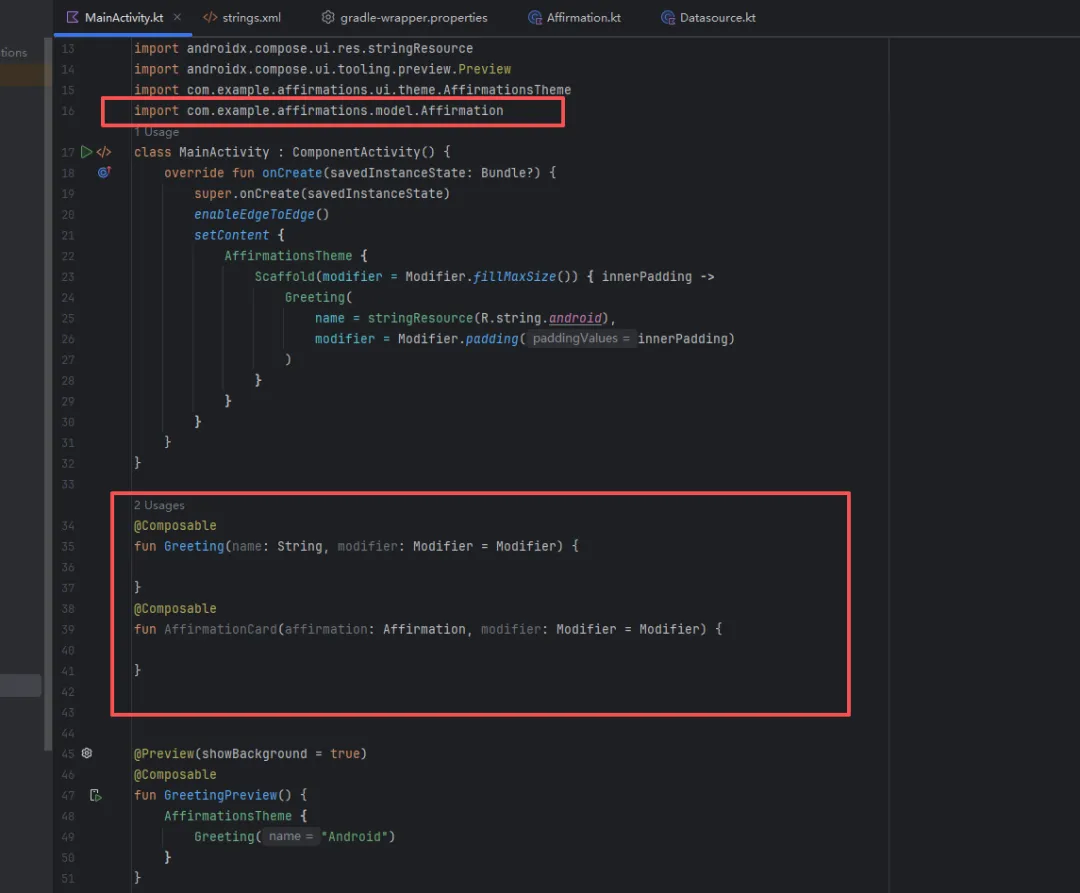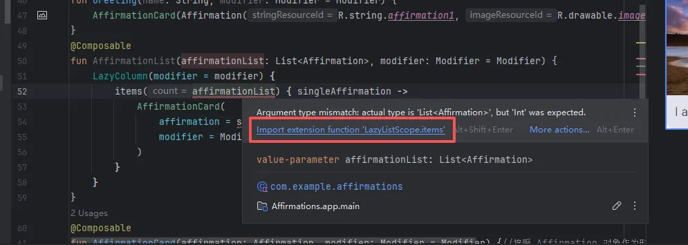 @ComposablefunAffirmationList(affirmationList: List<Affirmation>, modifier: Modifier = Modifier) {}