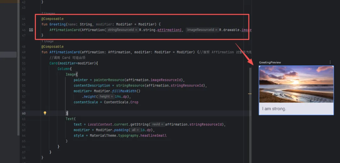 @ComposablefunAffirmationCard(affirmation: Affirmation, modifier: Modifier = Modifier) {//接受 Affirmation 对象作为形参,Affirmation 对象来自 model 软件包。//调用 Card 可组合项Card(modifier=modifier){Column{Image(painter = painterResource(affirmation.imageResourceId),contentDescription = stringResource(affirmation.stringResourceId),modifier= Modifier.fillMaxWidth().height(194.dp),contentScale = ContentScale.Crop//按比例放大 / 缩小(框内无空白,但图片可能被裁掉一部分。))Text(text = LocalContext.current.getString(affirmation.stringResourceId),modifier = Modifier.padding(16.dp),style = MaterialTheme.typography.headlineSmall//使用Material Design主题中定义的headlineSmall字体样式)}}}