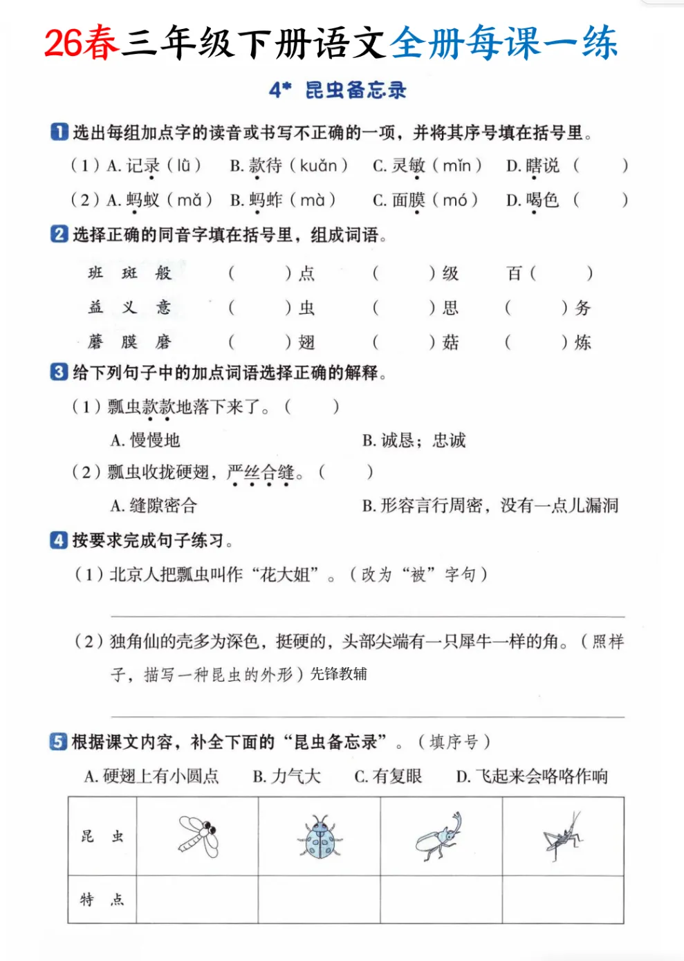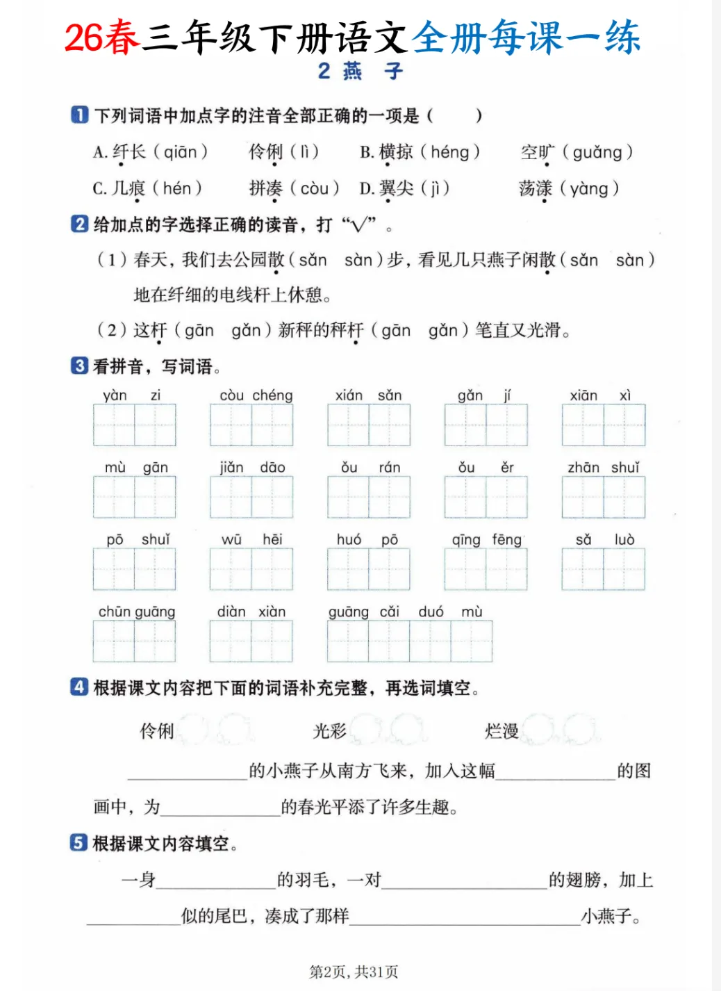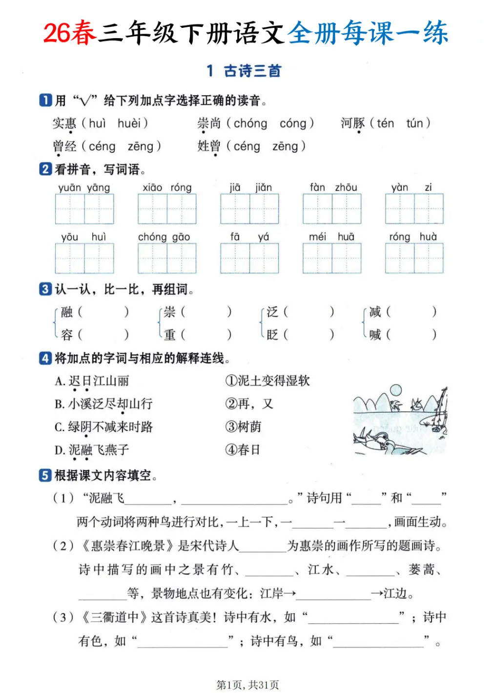 「【26春三下语文全册每课一练课时练(含答案31页).pdf」