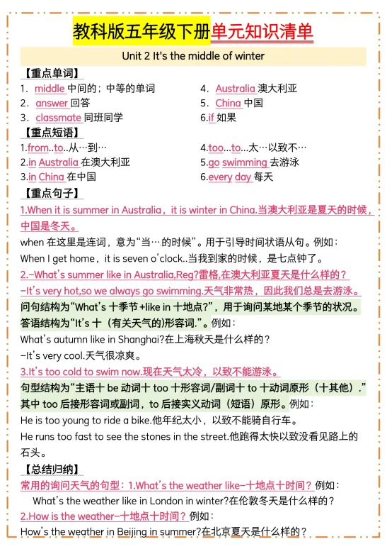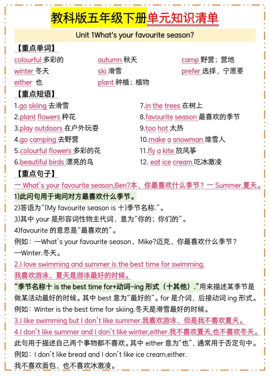 教科版五年级下册英语 单元知识清单 电子版!可下载!