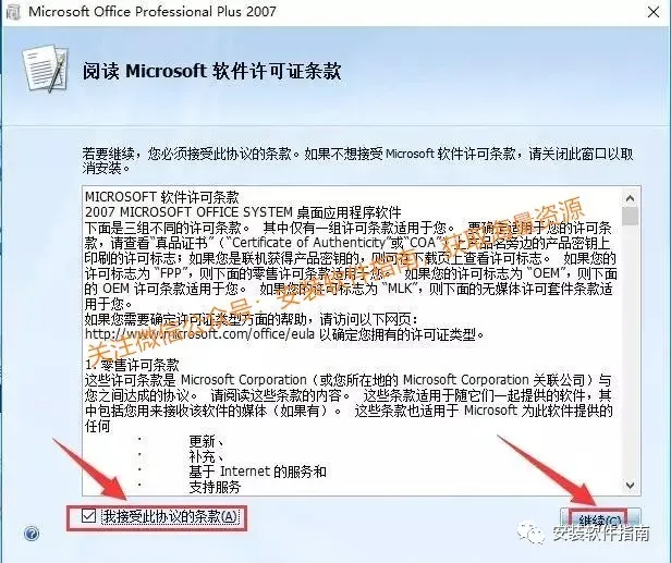 5、在【我接受《许可协议》中的条款】前打对勾,然后点击【继续】