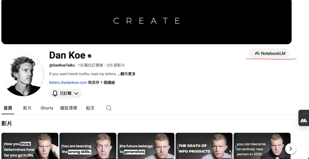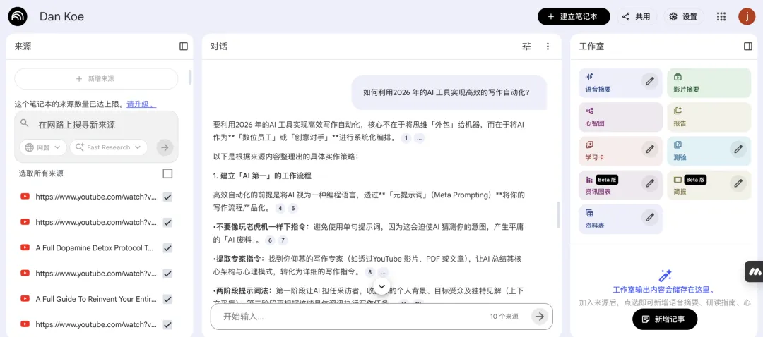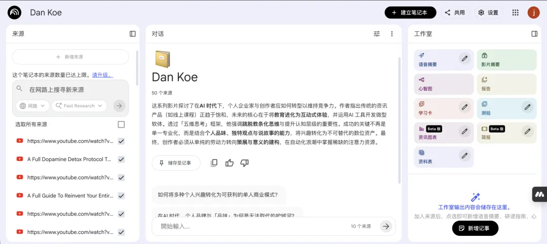 从“点”到“面”:以前你只能问 Gemini 关于“这一个视频”的问题。现在,你把 Dan Koe 近三年的视频全部倒进 NotebookLM,你就拥有了一个数字版 Dan Koe。你可以问他:“基于你过去所有关于‘专注力’的分享,我现在的自由职业瓶颈该怎么破?” -