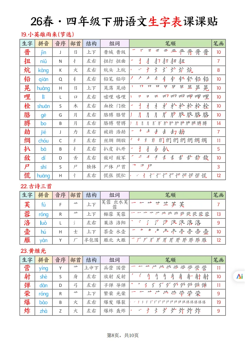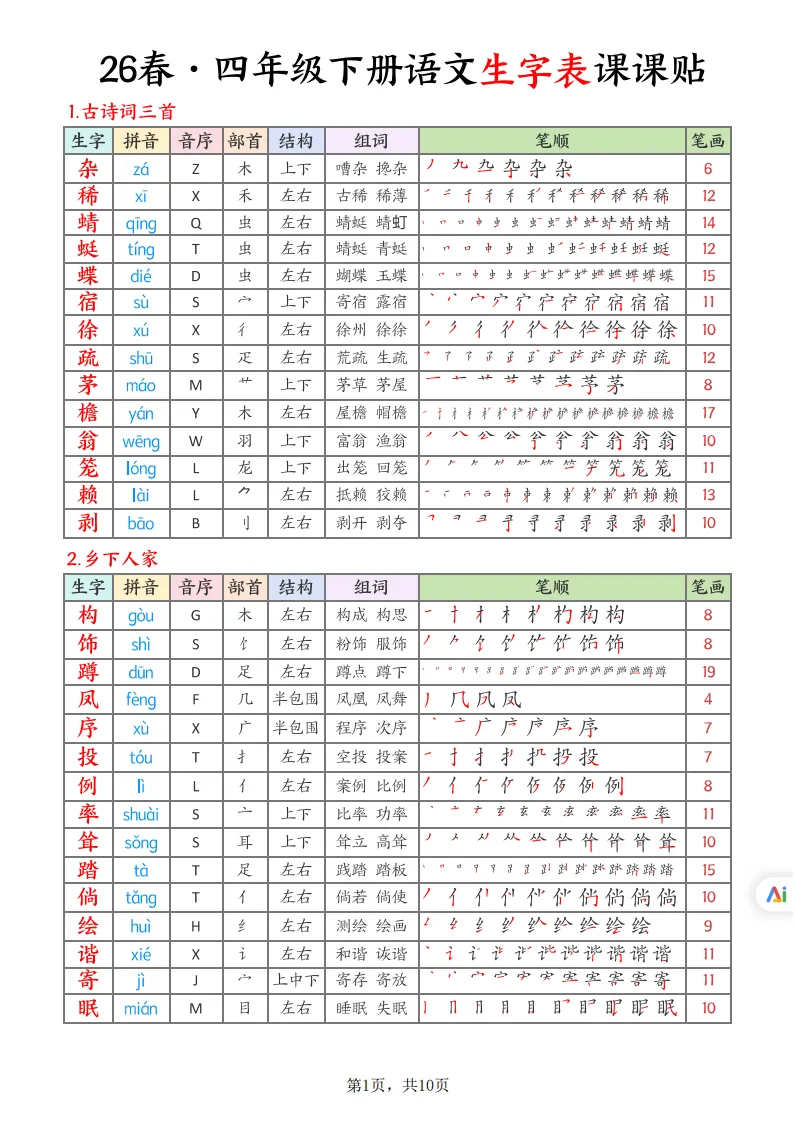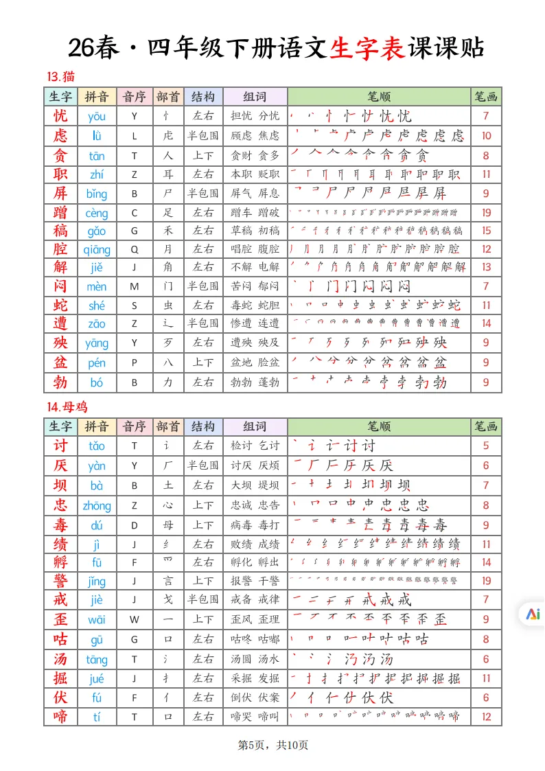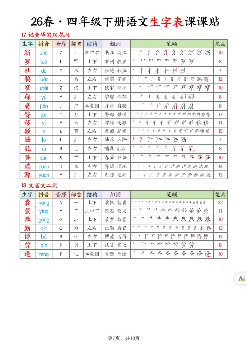 四年级语文下册生字学习不用慌!这份 26 春生字表课课贴整理了全册所有生字,从拼音、音序到部首、结构,再到组词、笔顺笔画,讲解细致全面,完全同步课本,打印出来孩子每天练,轻松掌握生字要点,家长辅导超省心。