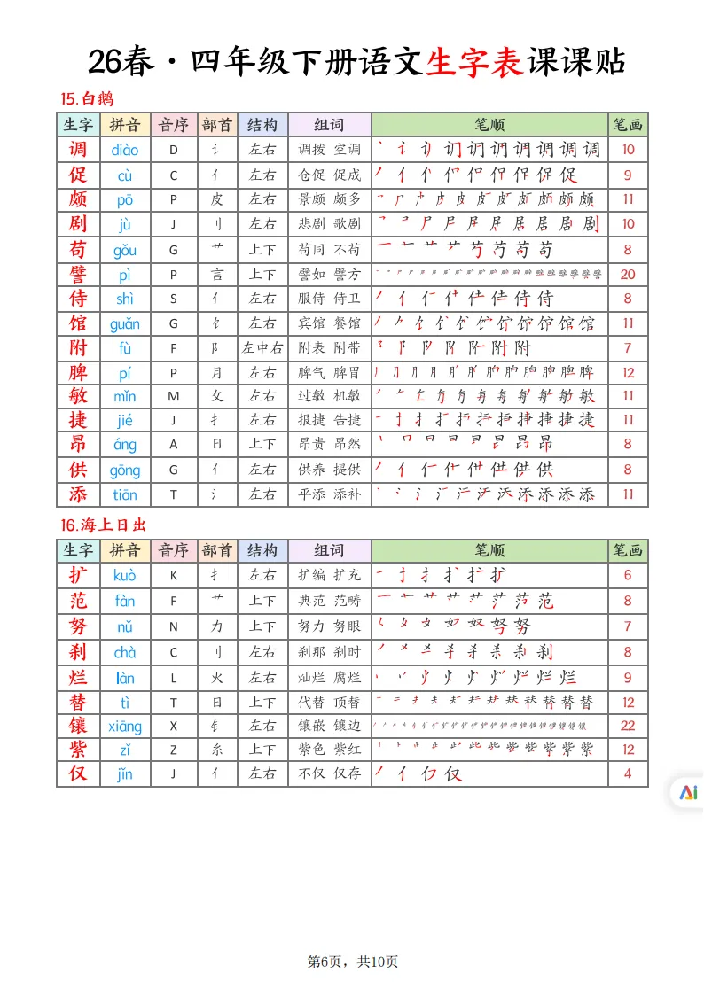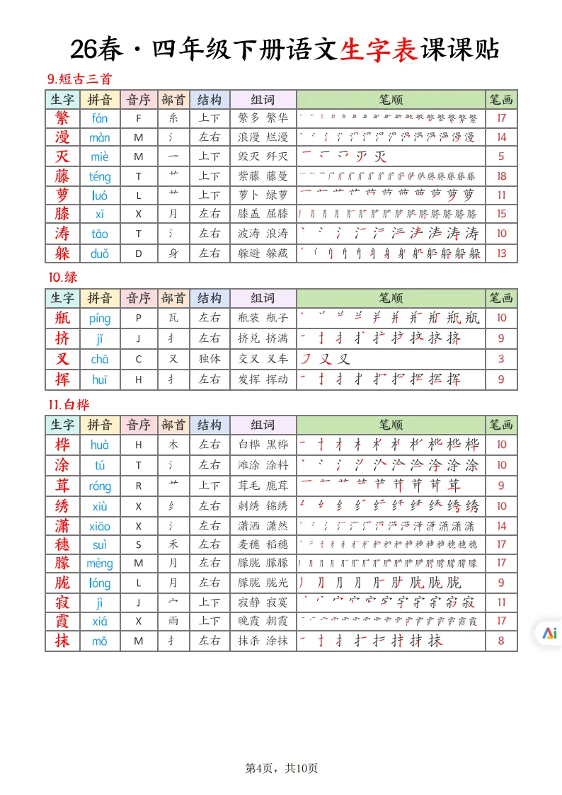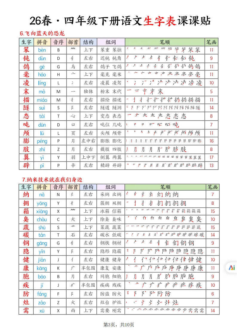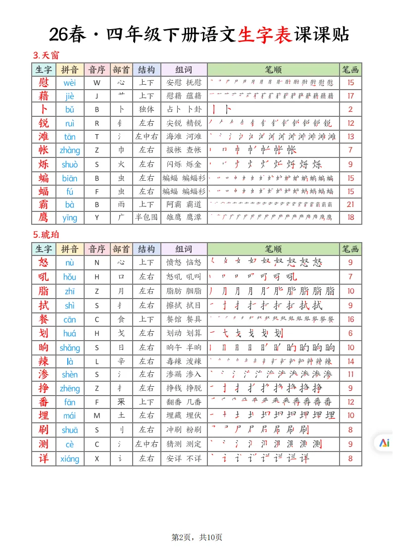 四年级语文下册生字学习不用慌!这份 26 春生字表课课贴整理了全册所有生字,从拼音、音序到部首、结构,再到组词、笔顺笔画,讲解细致全面,完全同步课本,打印出来孩子每天练,轻松掌握生字要点,家长辅导超省心。