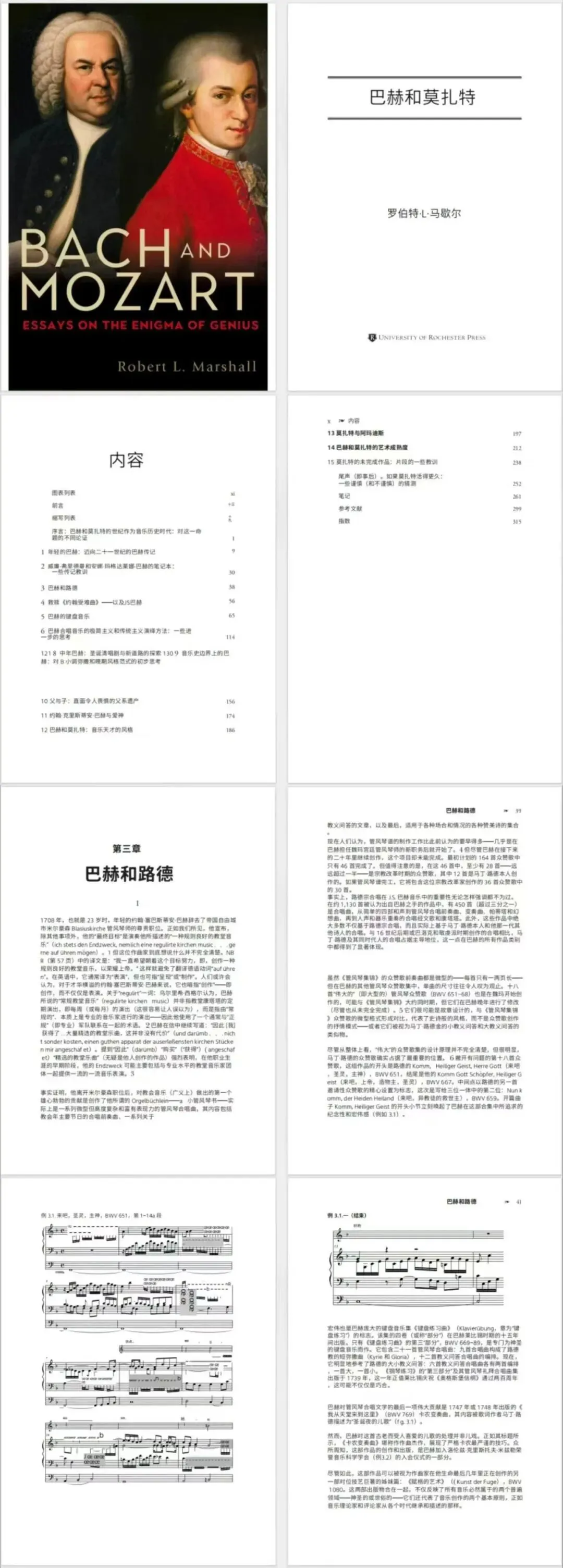 在对 “巴赫与莫扎特时代” 进行初步史学思考后,本书以大致编年的顺序呈现了 15 篇编号章节。书中探讨的议题包括:巴赫的孤儿经历对其艺术创作的影响、他与马丁・路德(Martin Luther)的关联、他对犹太人的态度、他与儿子们的关系、其音乐风格发展的不同阶段及他在音乐史上的地位;转向莫扎特的部分则涵盖:电影《莫扎特传》)对这位作曲家的刻画、他的诙谐特质、他巴赫的借鉴,以及其创作过程的多个方面。