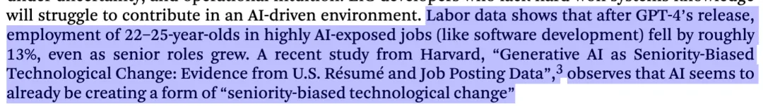 他们的点很简单:Agentic 编码助手会放大资深工程师,因为资深工程师已经拥有驾驭、验证和整合 Agent 产出的判断力。Early-in-Career(EiC)开发者没有。同样的工具反而可能拖慢他们,甚至误导他们。这一逻辑引出的经济激励几乎是自动的:雇资深、让 Agent 吃掉初级工作。