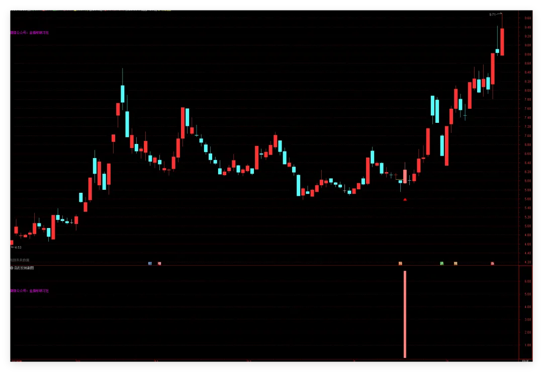 条件 :股价经历了一波下跌,留下一个衰竭缺口。随后在底部震荡,突然某天出现浅红柱信号 ,且股价同时站上20日均线。操作 :这是典型的主力建仓完毕信号。此时不要犹豫,收盘前直接打板或半路追入。