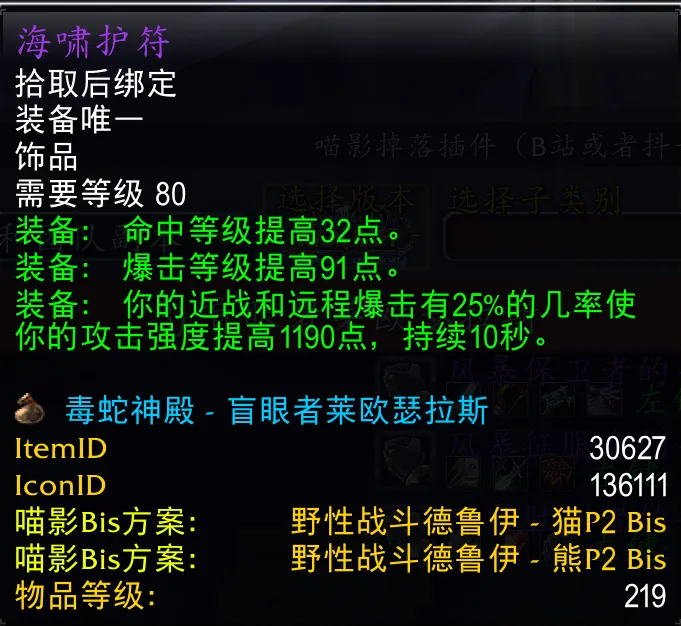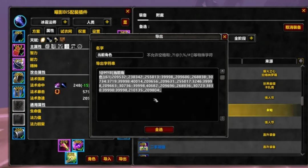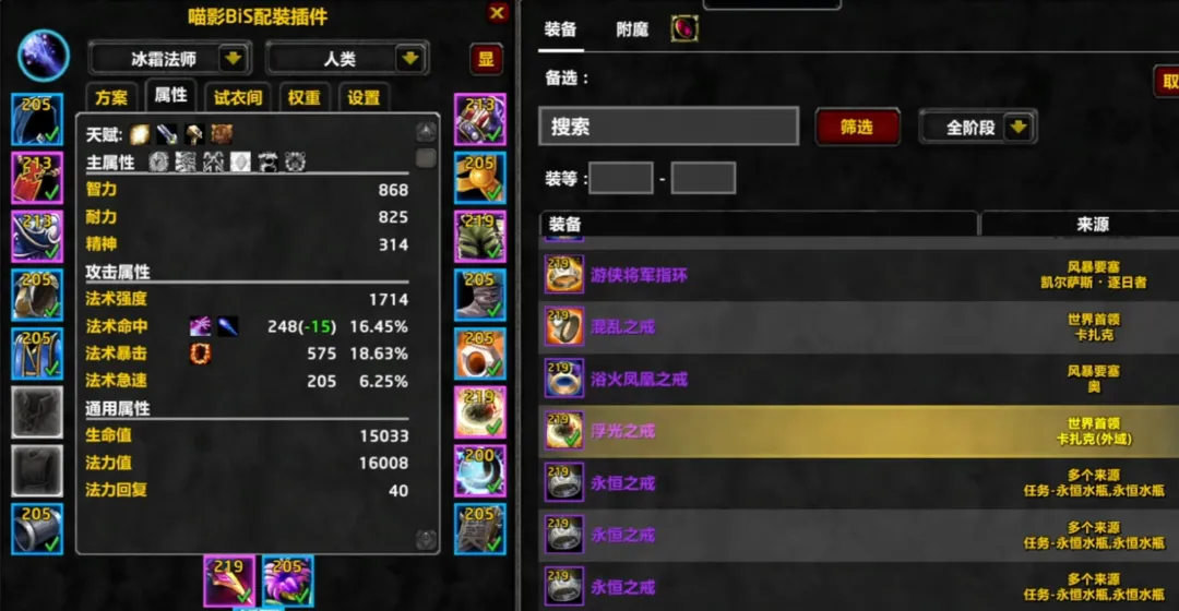 喵影bis配装插件并非只能显示bis配装信息,它本质上是一个配装模拟器,玩家需先选好职业、专精和种族,然后导入角色装备或其他预设bis配装,每件装备的珠宝和附魔都可以自定义调整,属性面板将会实时显示当前配装的各项属性,记得勾选相关天赋、团队BUFF和DEBUFF以显示打团时的实际属性。插件会贴心的告诉你当前配装命中精准是否达标,例如上图在勾选了强化精灵之火DEBUFF和法师精准天赋后还差15命中等级才能保证满命中,这样玩家就知道插1个16命中等级的刚硬秋色石即可补齐命中了。别小看了这一功能,打团本时BOSS掉落一件看起来不错的装备但又担心换上后命中或精准不够的情况经常发生吧,有此插件就可以趁团长拍卖前先模拟调配,以免陷入高价买到装备后却发现配不齐命中或精准的窘境。