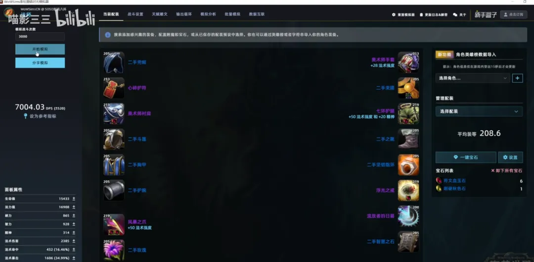 很多情况下命中精准都可以靠珠宝附魔强行补满,玩家更关心“我买了这件装备后DPS是否能提升?”以及“能提升多少?”这两个问题,这就需要用到喵影bis配装插件支持一键导出配装信息功能借助DPS模拟器了。