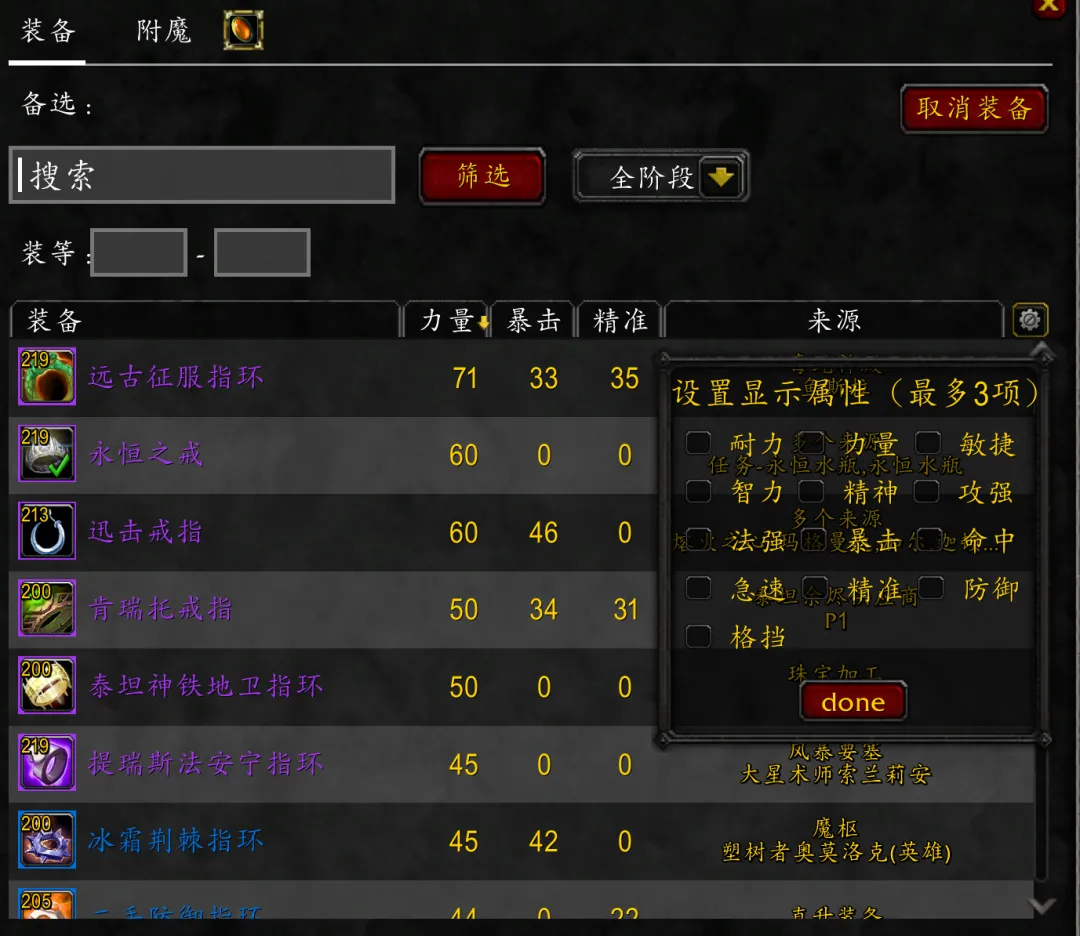 喵影bis配装插件还自带装备数据库,支持最多3项属性筛选,比如想找到P2阶段力量最高的戒指,点几下就能查询到结果非常方便。