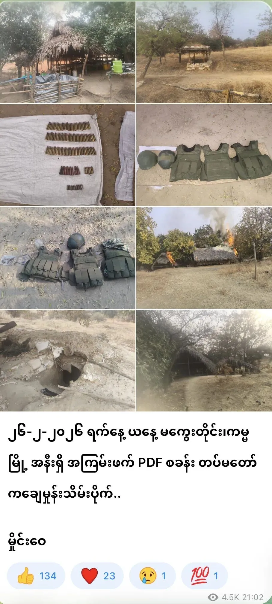 2026年2月26日今日,在马圭省甘马镇附近的一处”PDF”营地,被军方清剿并占领。