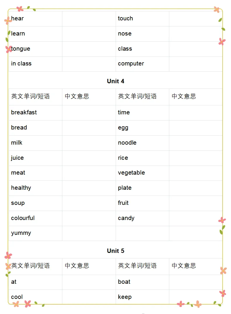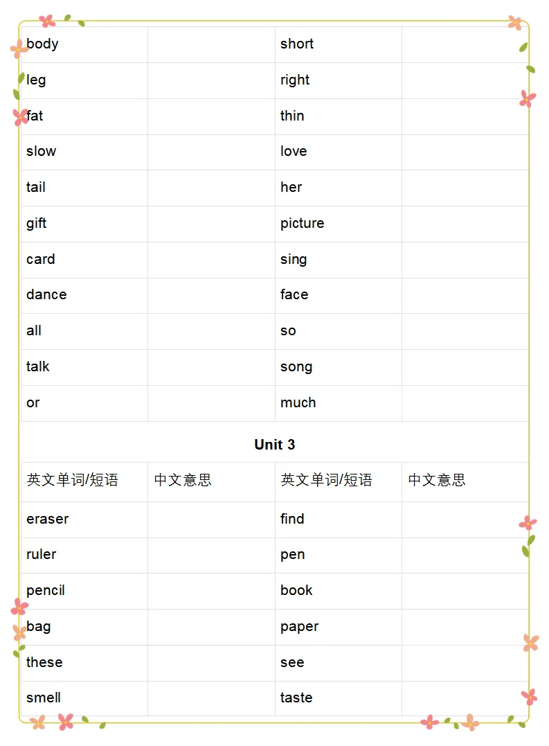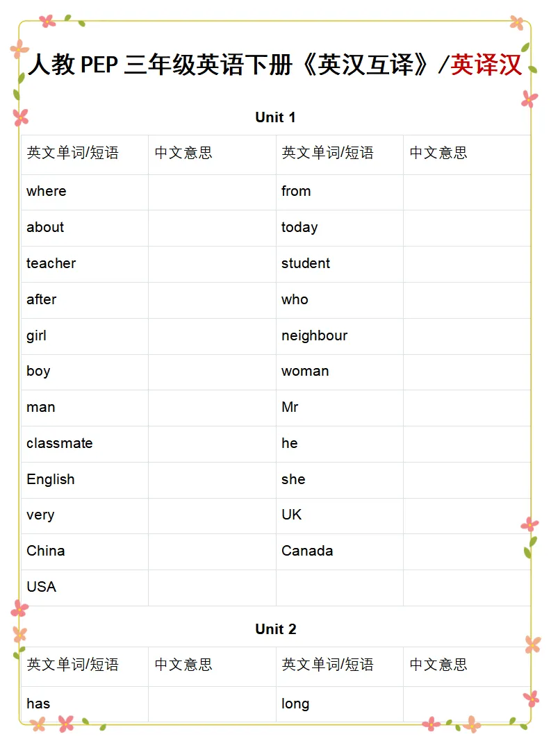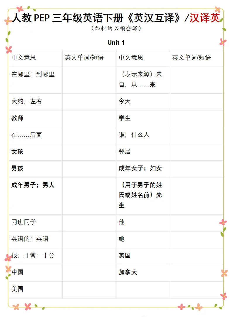 2026人教PEP三年级英语下册单词表《英汉互译练习》,可下载打印 高清图片,可保存原图打印。