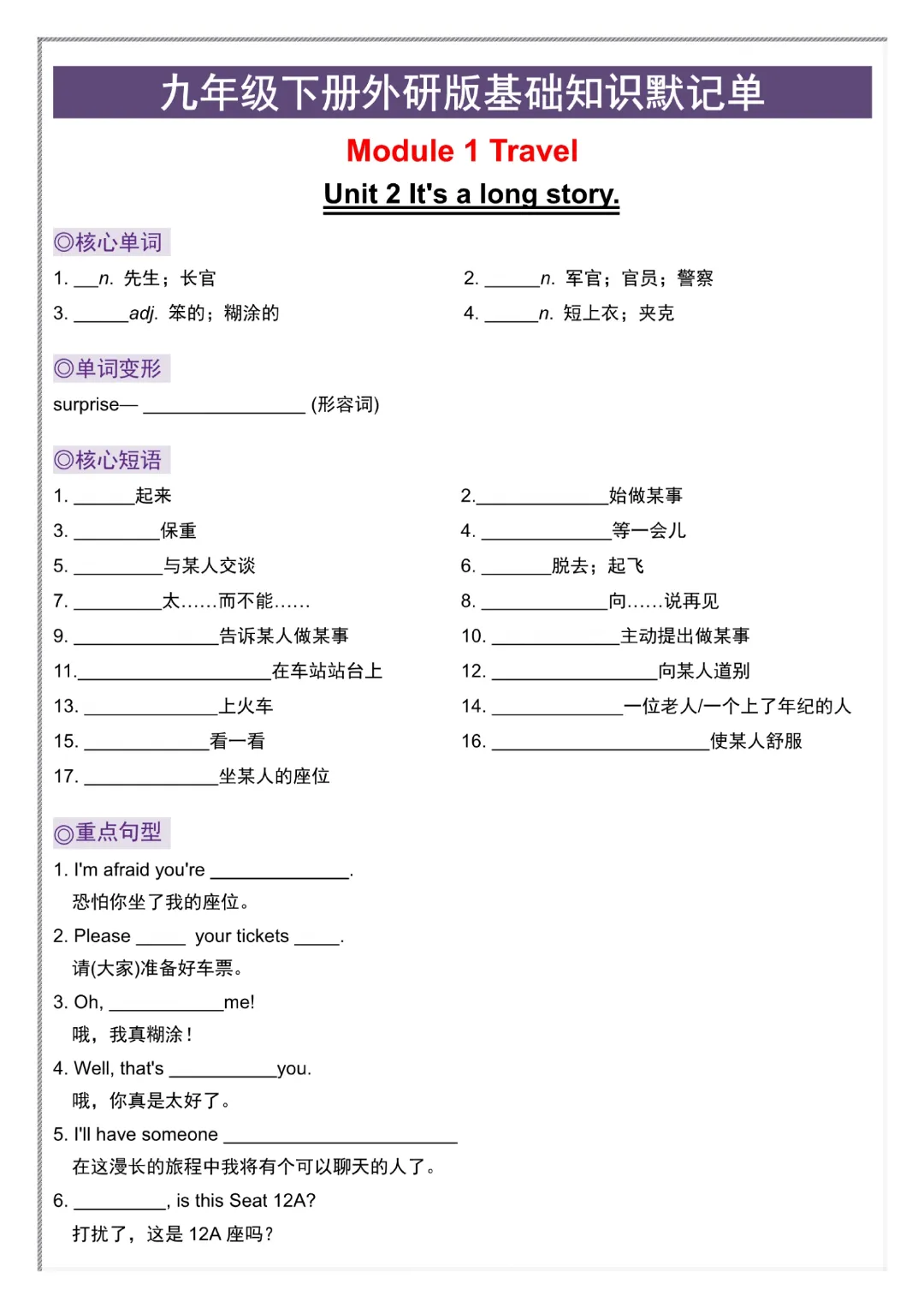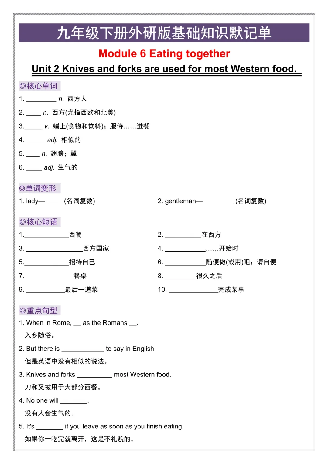 【九年级下册英语外研版】初三下册英语基础知识默记单+答案|完整高清可打印