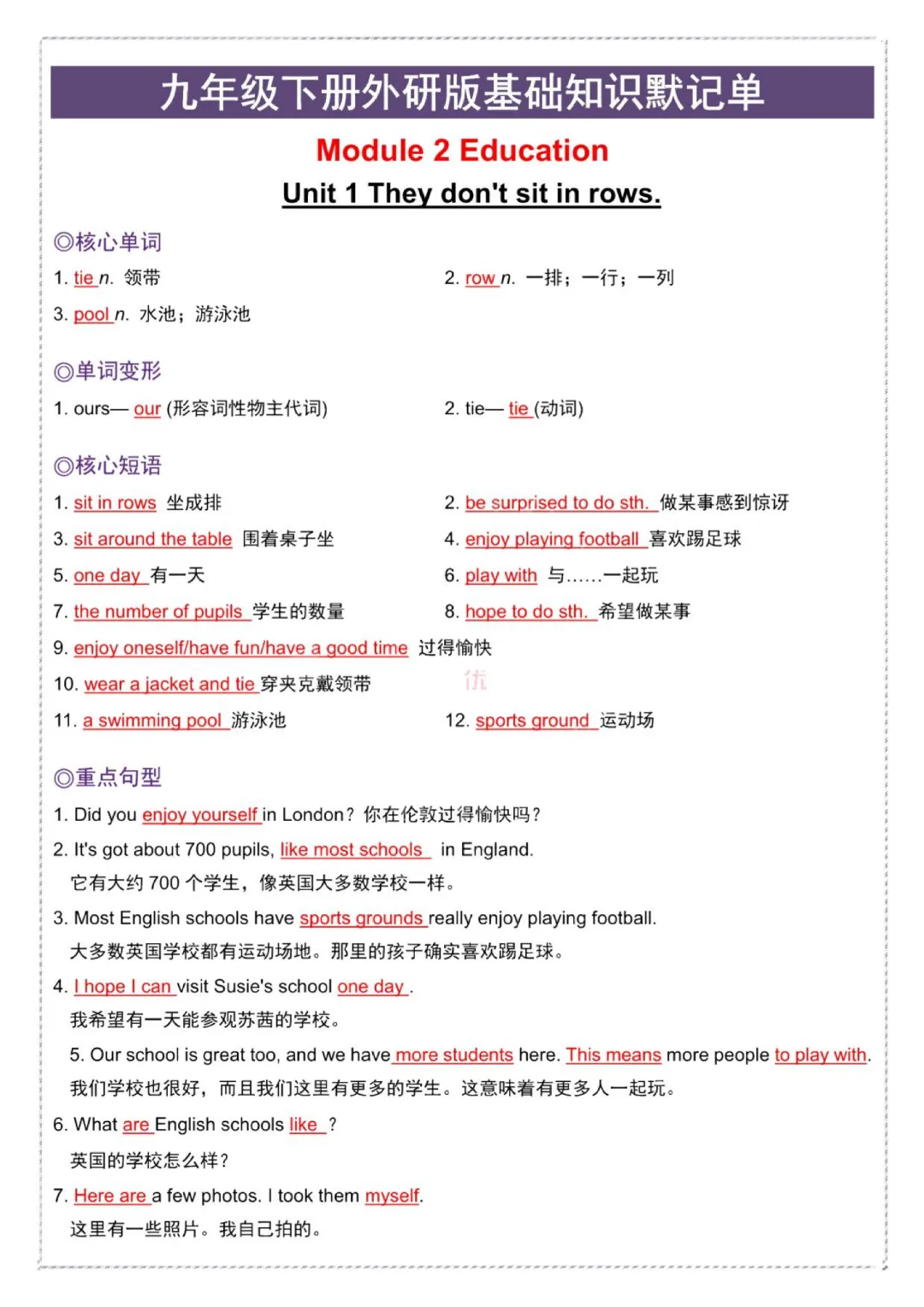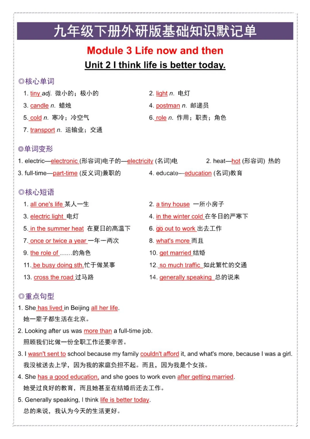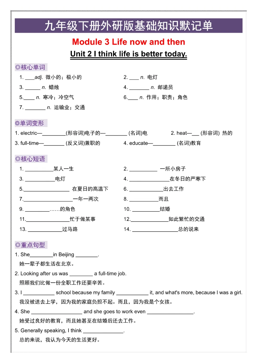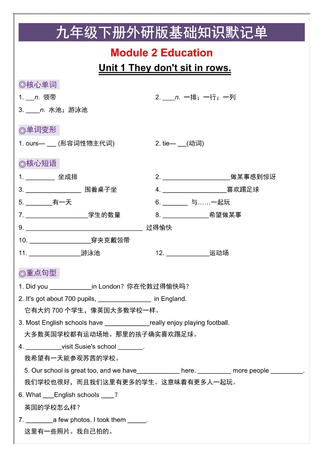 今日给大家分享的是:【九年级下册英语外研版】初三下册英语基础知识默记单+答案|完整高清电子版可打印