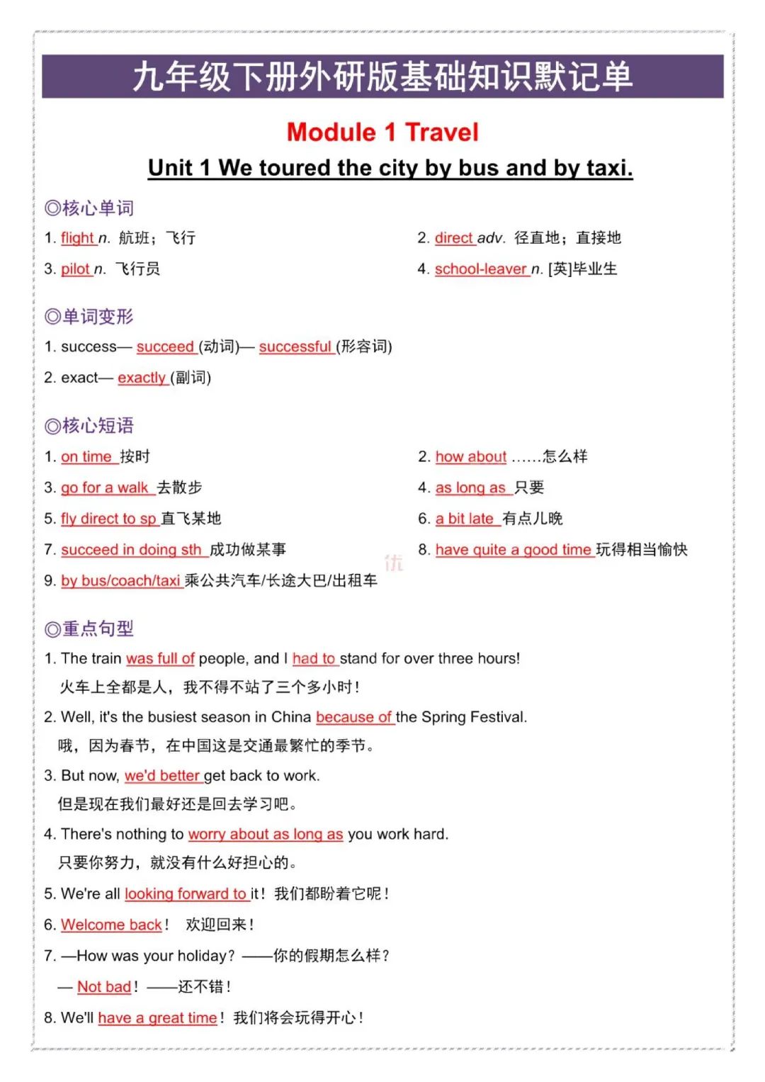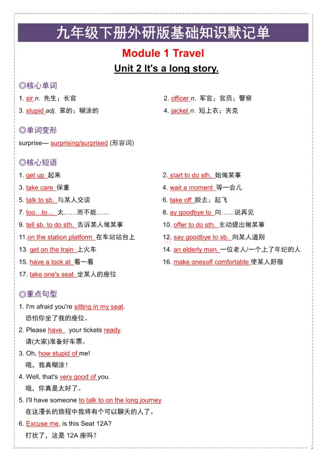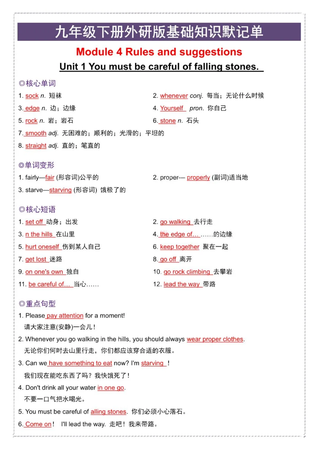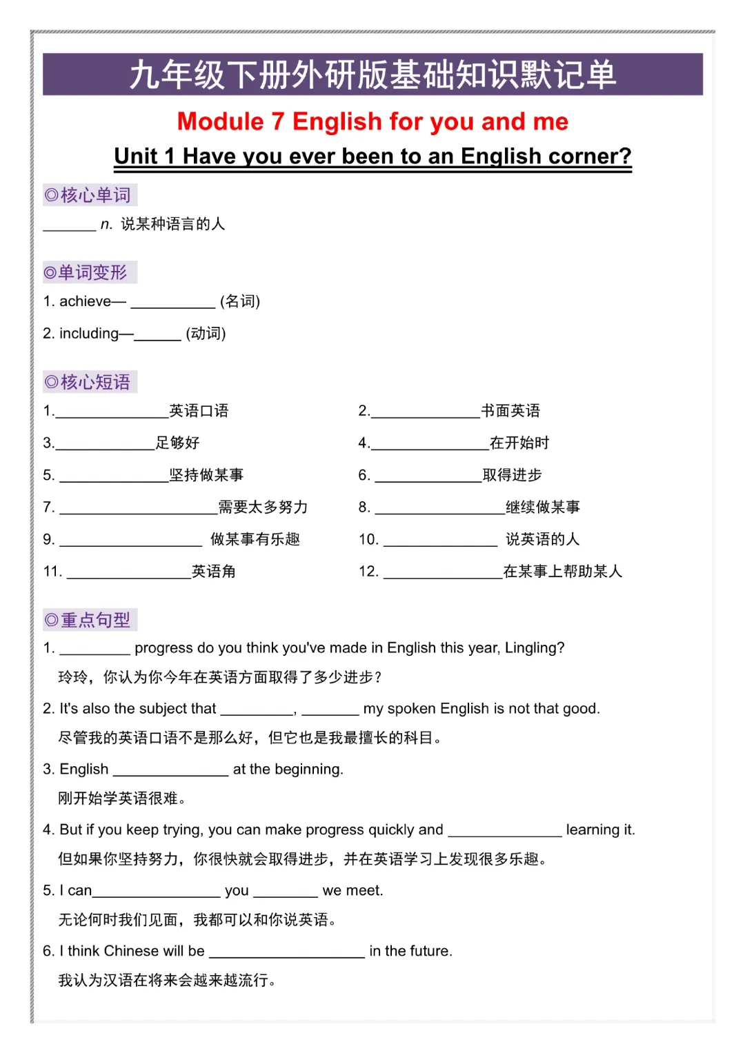 今日给大家分享的是:【九年级下册英语外研版】初三下册英语基础知识默记单+答案|完整高清电子版可打印