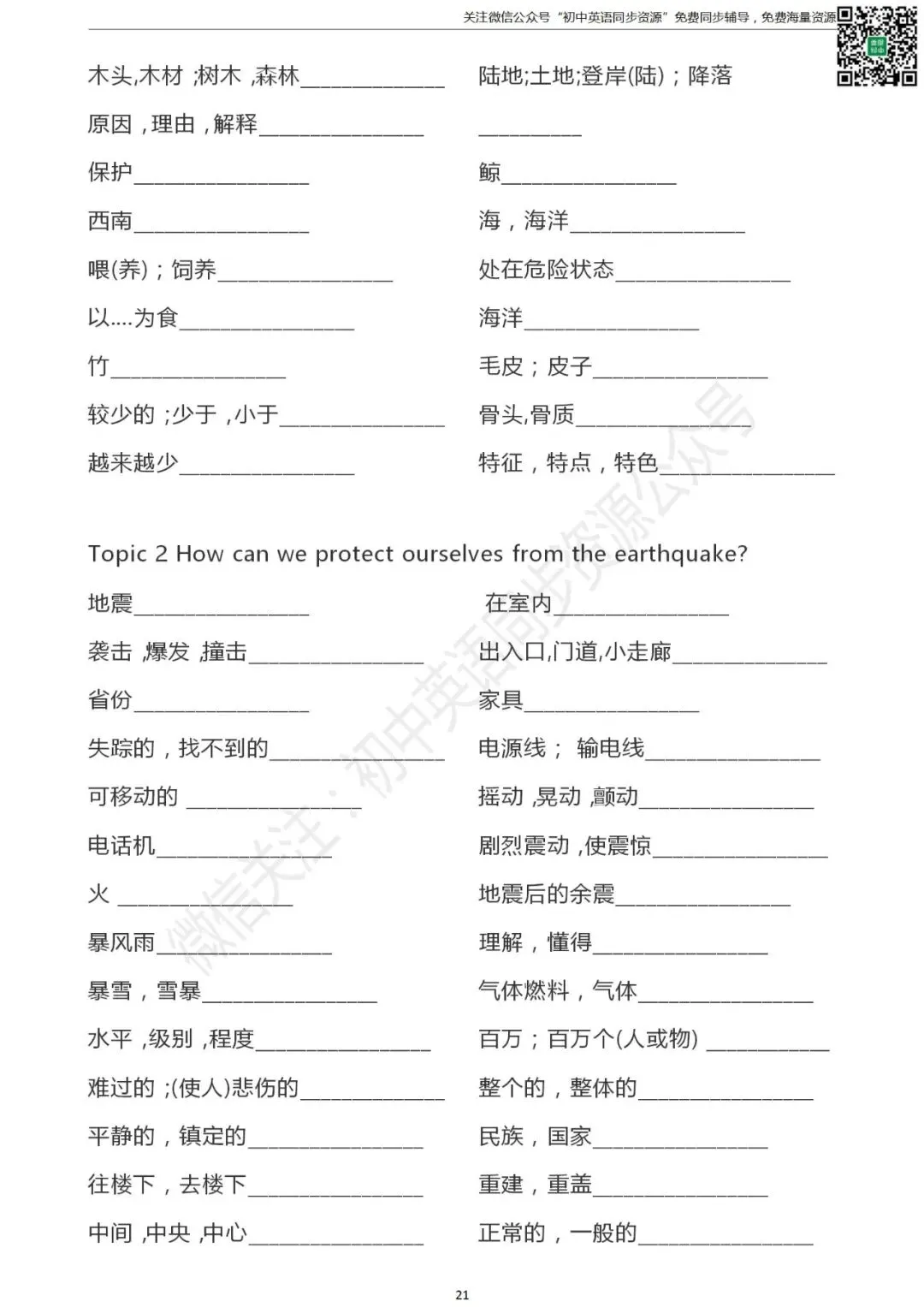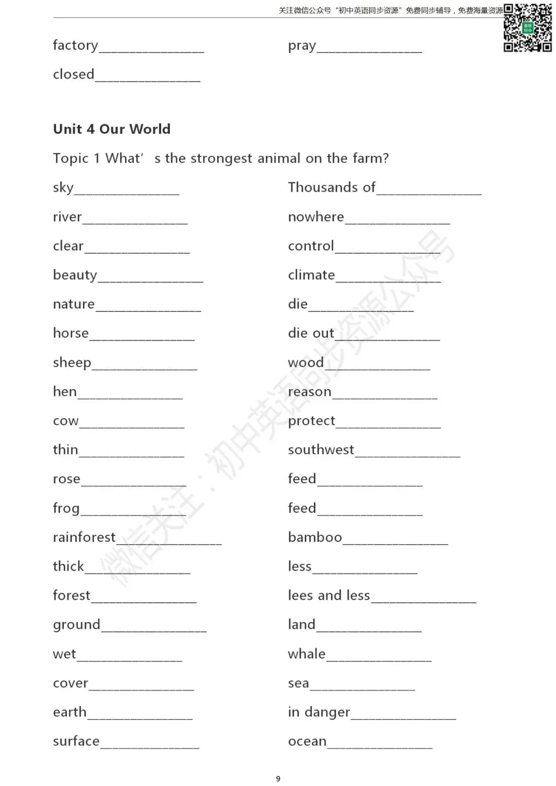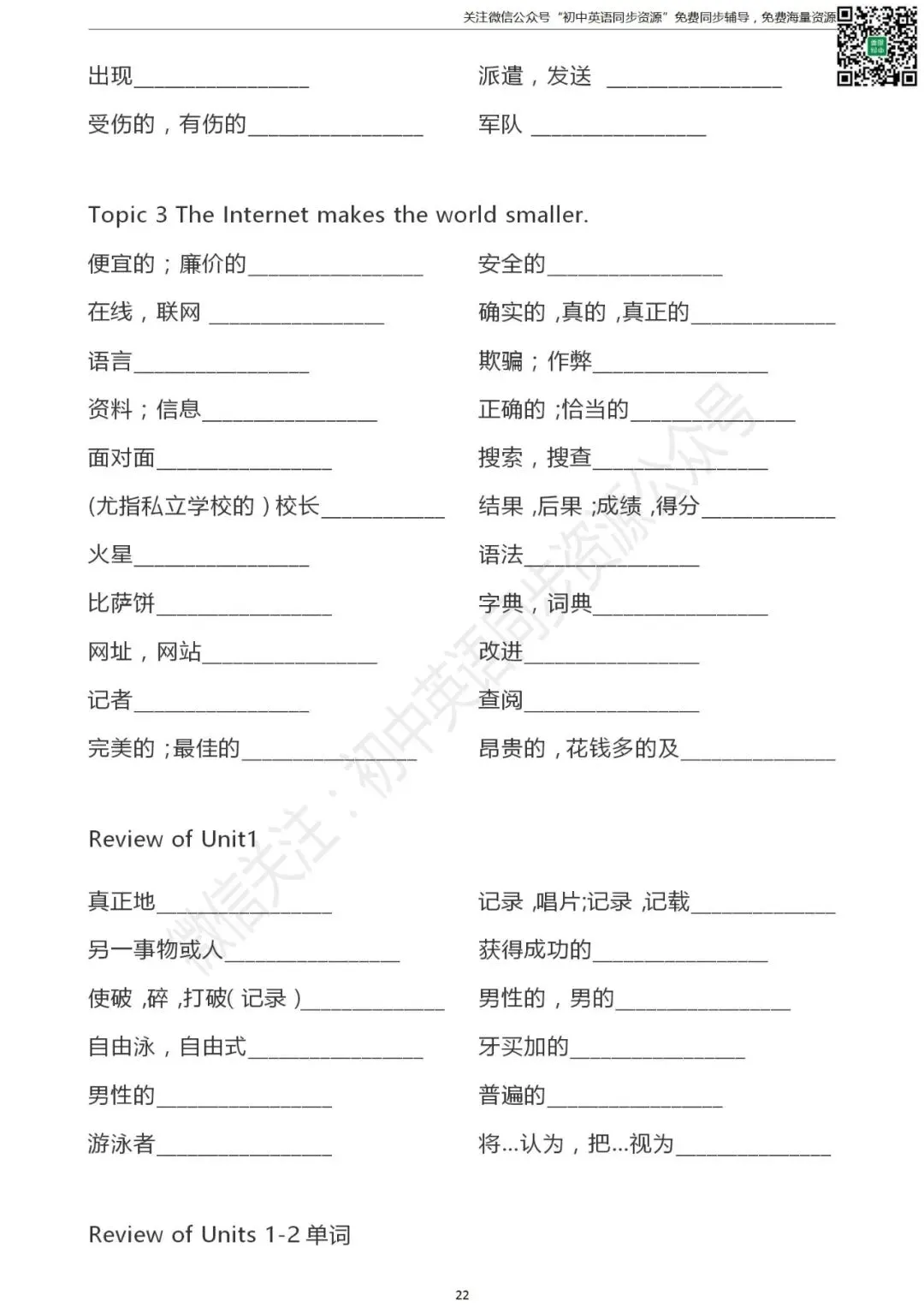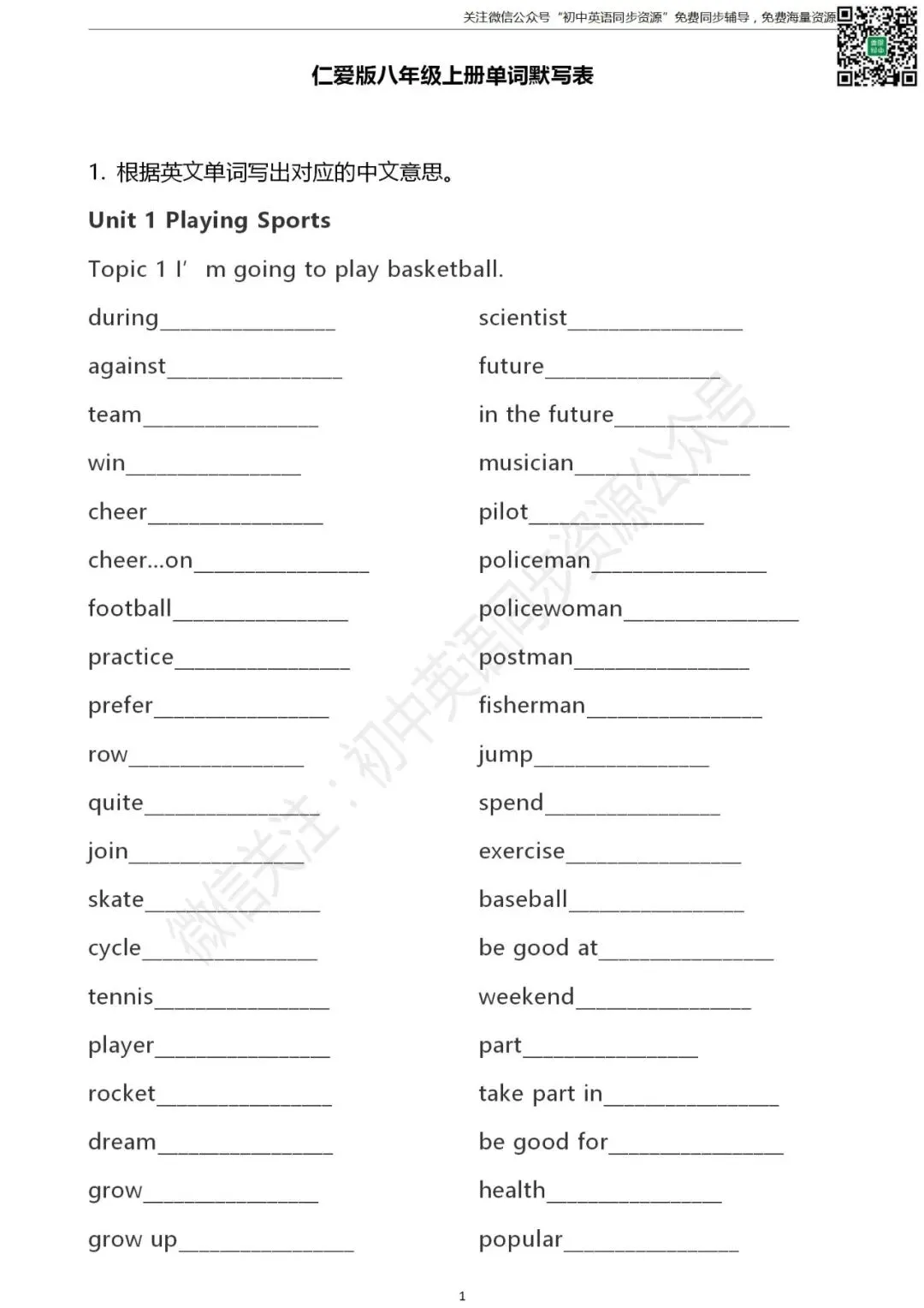 仁爱版 初中英语 八年级上册单词默写表(可打印)