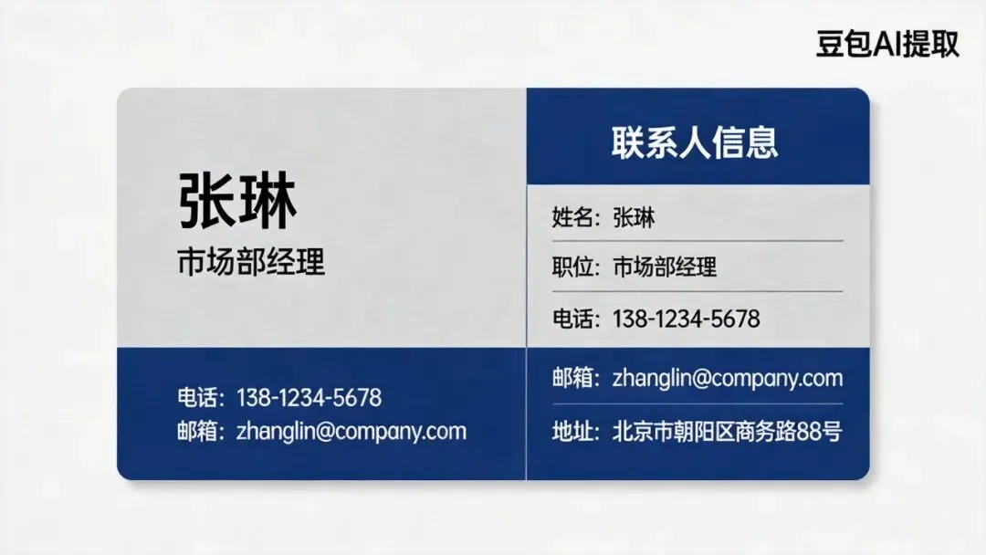 豆包会把名片上的姓名、电话、邮箱、公司、职位等信息提取出来,整理成结构化的格式。我试过几张名片,基本都能准确识别,就算名片设计得很花哨也没问题。