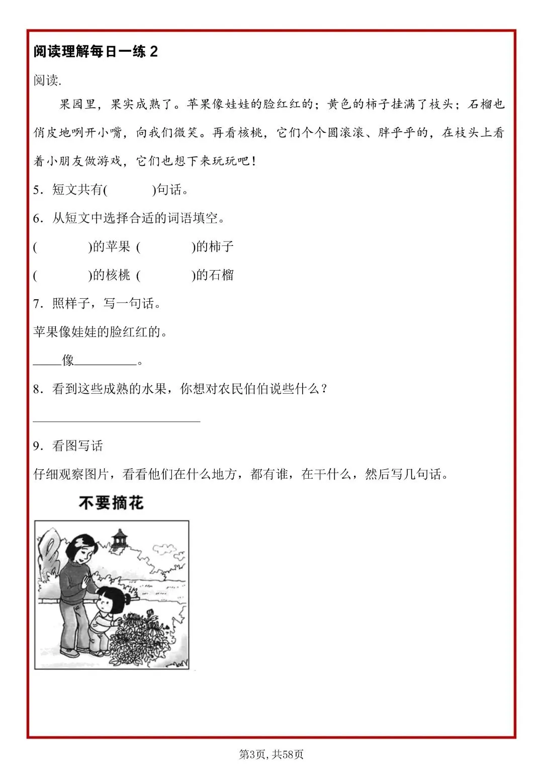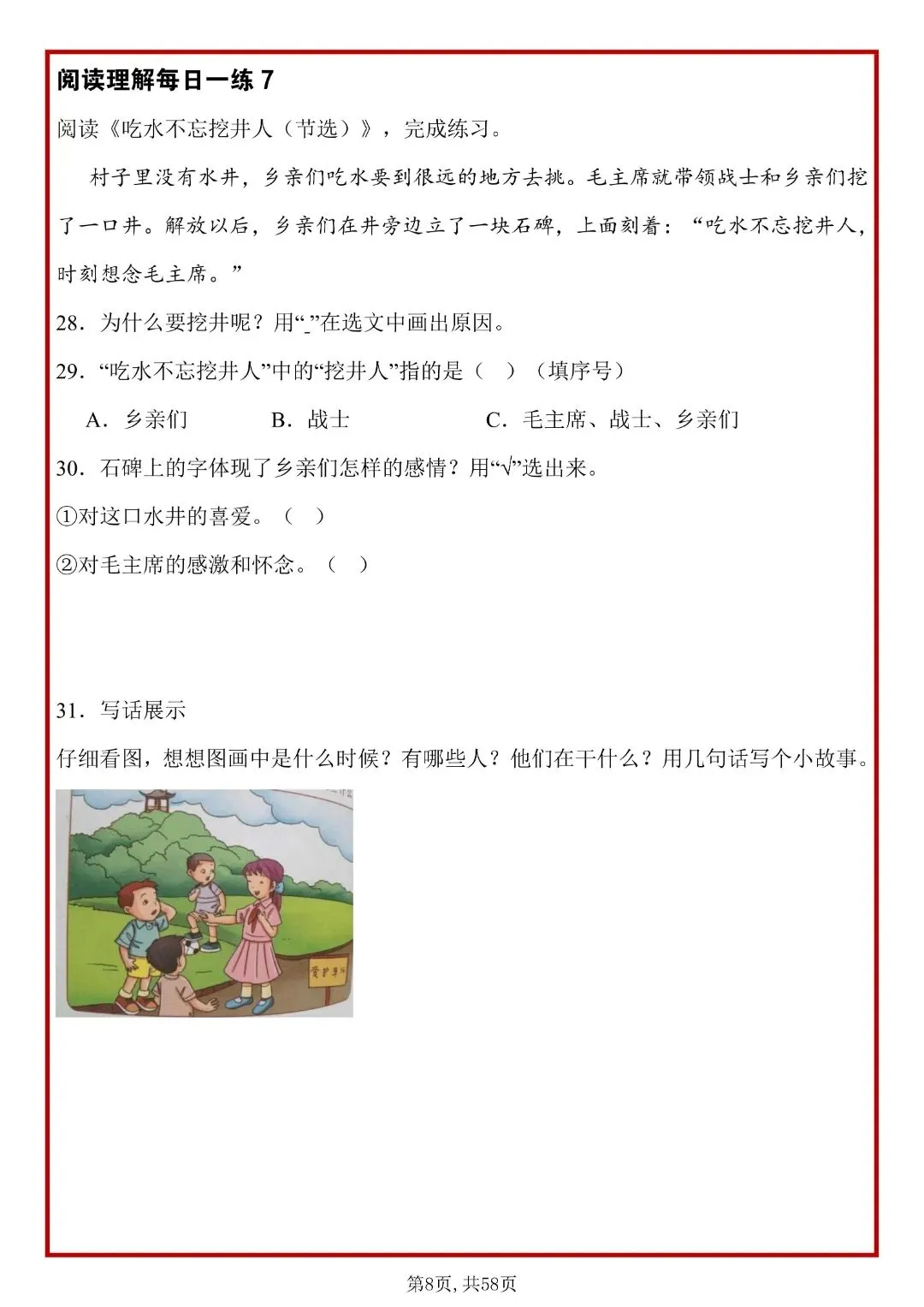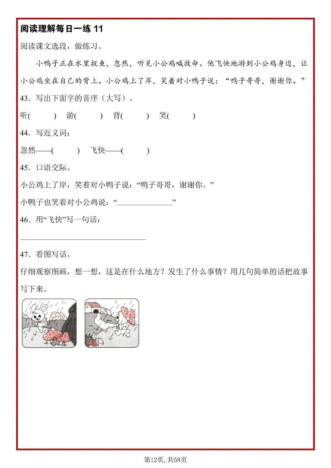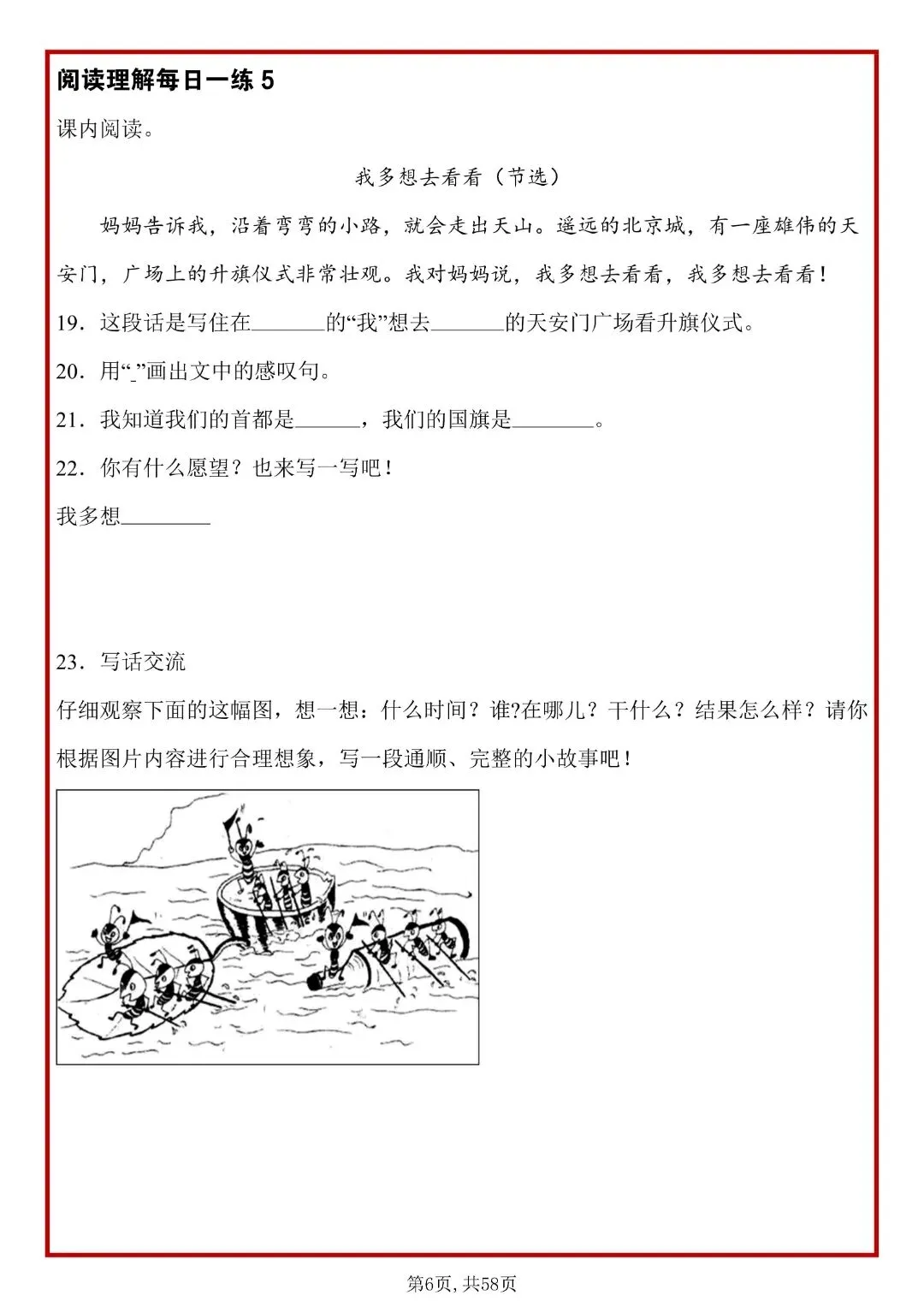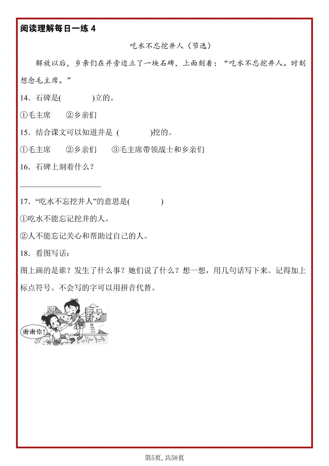 26春人教部编版一年级下册语文《阅读理解常考题型每日一练》,共58页,含答案,电子版可打印。每天练,能熟练掌握:概括段意、找中心句、理解词句、分析人物情感、答题套路。帮助孩子提升思维理解能力,养成良好的学习习惯,提升学习成绩。有需要的家长快打印给孩子练一练。