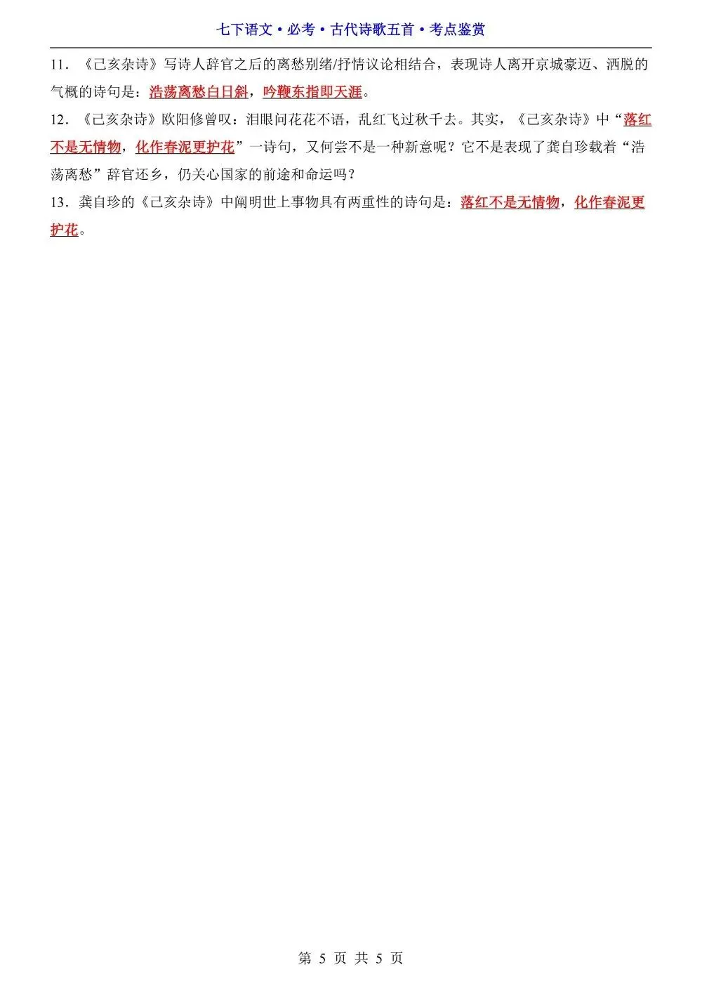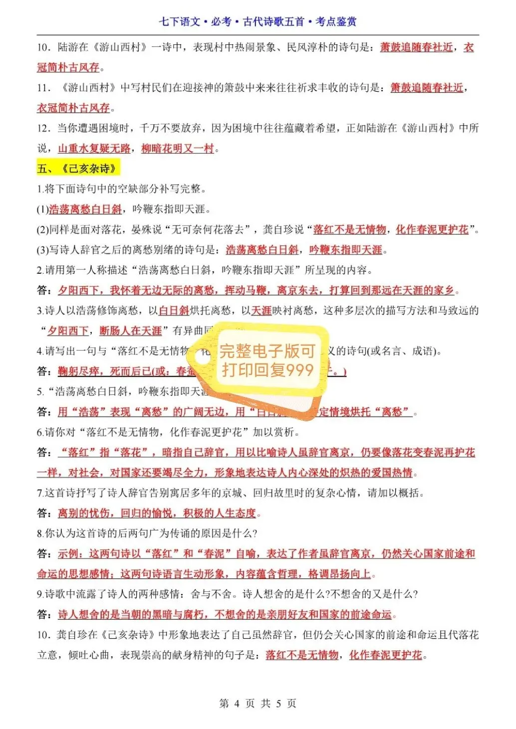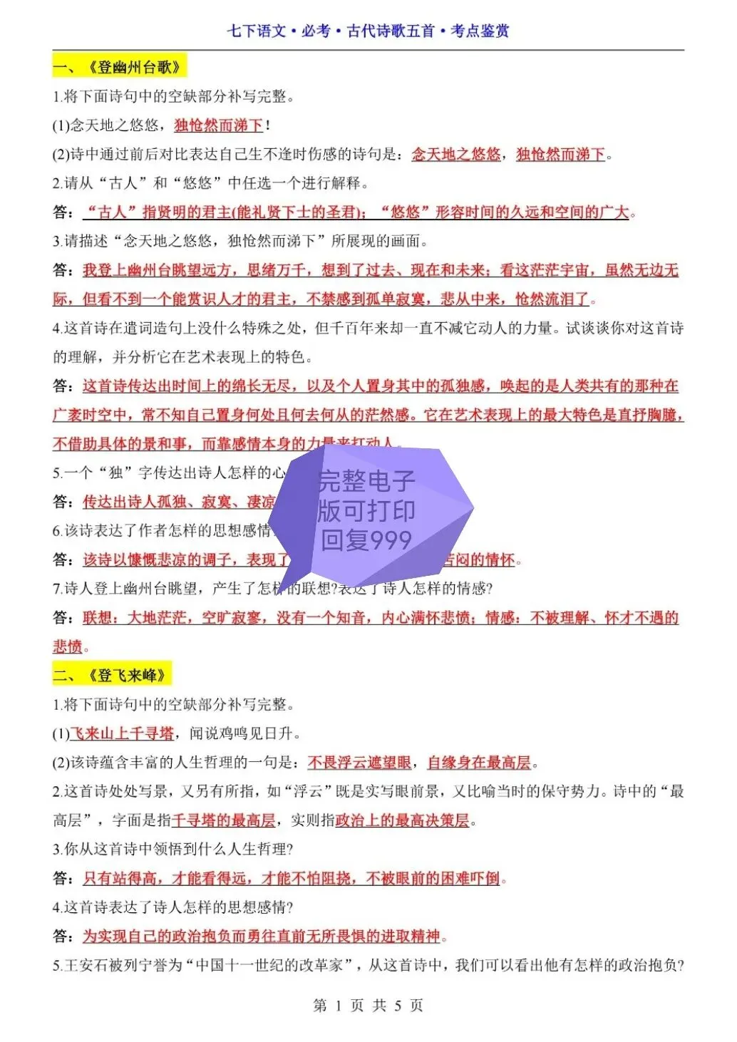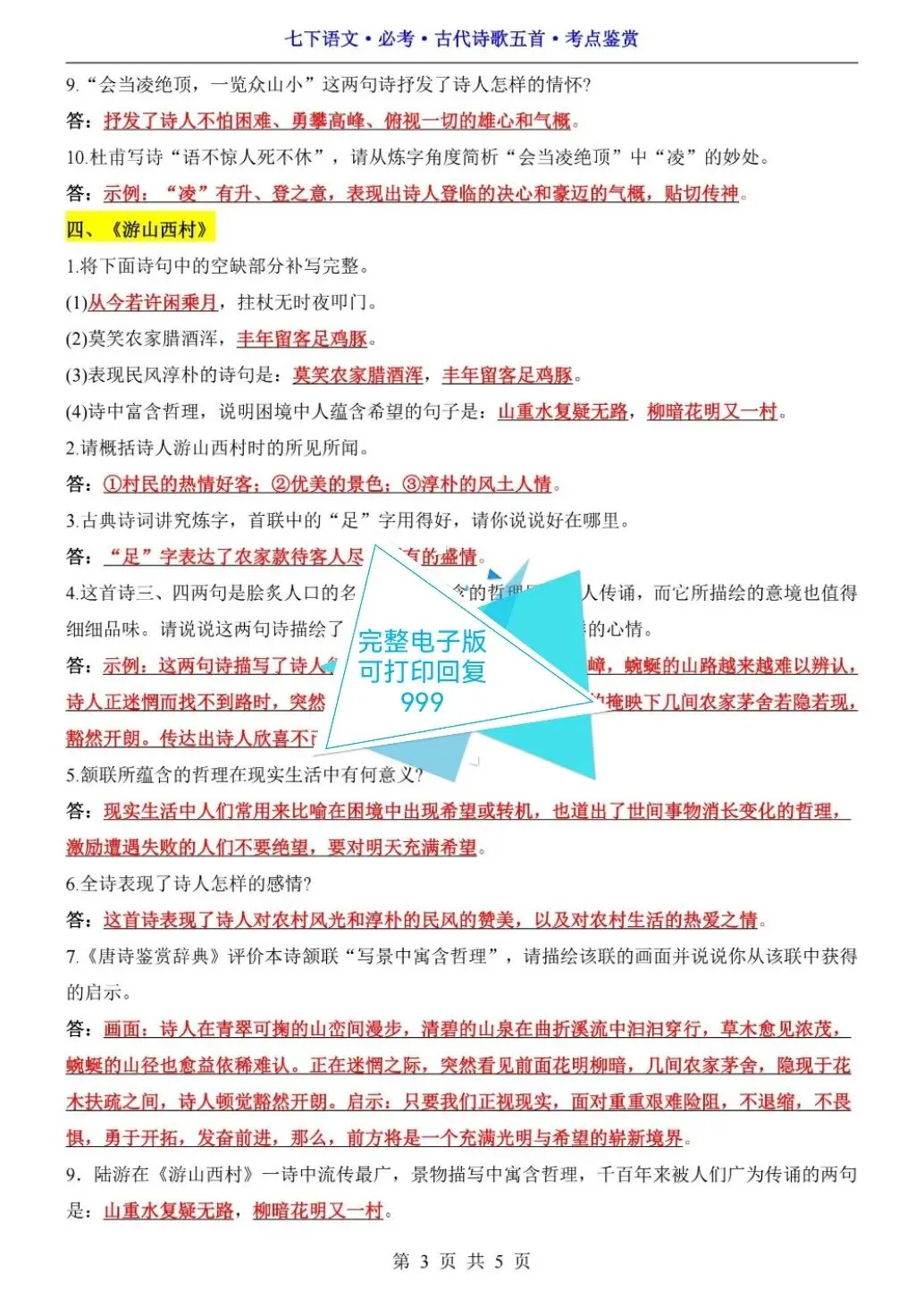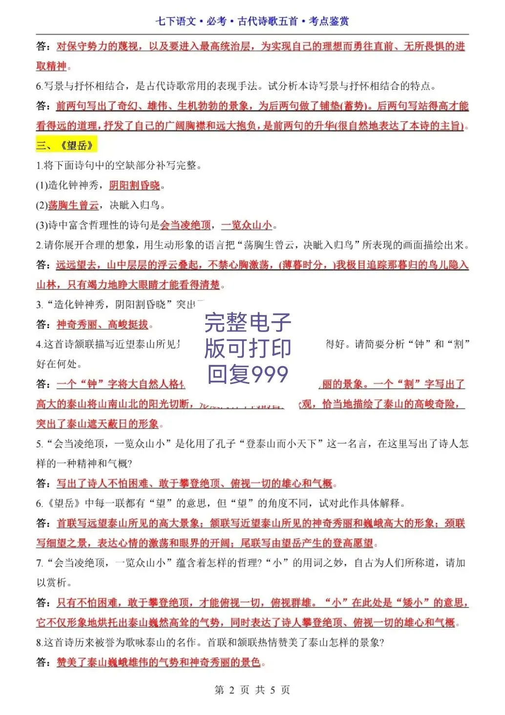 七年级下册语文必考古诗五首考点鉴赏(可打印)