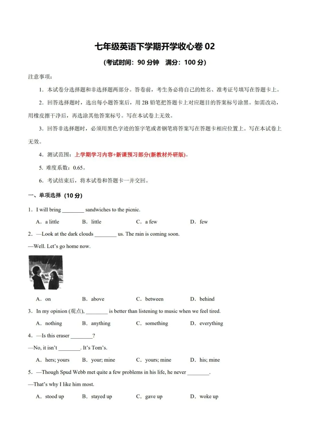 七年级英语下学期开学收心卷02(外研版)(原卷版)含解析答案 完整高清可打印 点击蓝字,关注我们 今日资料分享 因公众号篇幅有限,完整电子版领取方式如下 完整电子版领取方式: ①:点一点右下角的“”和“” ②:在公众号消息栏“发消息”,输入:【888号资料】 点分享 点收藏 点在看 点点赞