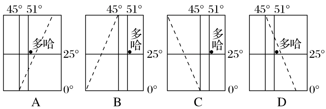 解析 东三区的区时是45°E经线上的地方时,决赛于当地时间(东三区)12月18日18时进行,此时,多哈(51°34′E)的地方时约为18时26分;该日太阳直射点位于南半球,北半球昼短夜长,多哈位于北半球,也是昼短夜长;18时26分时,多哈已经进入黑夜,但是进入黑夜不久,晨昏线的昏线位于多哈西侧;昏线呈西北-东南方向延伸(确保北半球昼短夜长),故C图晨昏线的位置与当日昼夜分布一致。故选C。