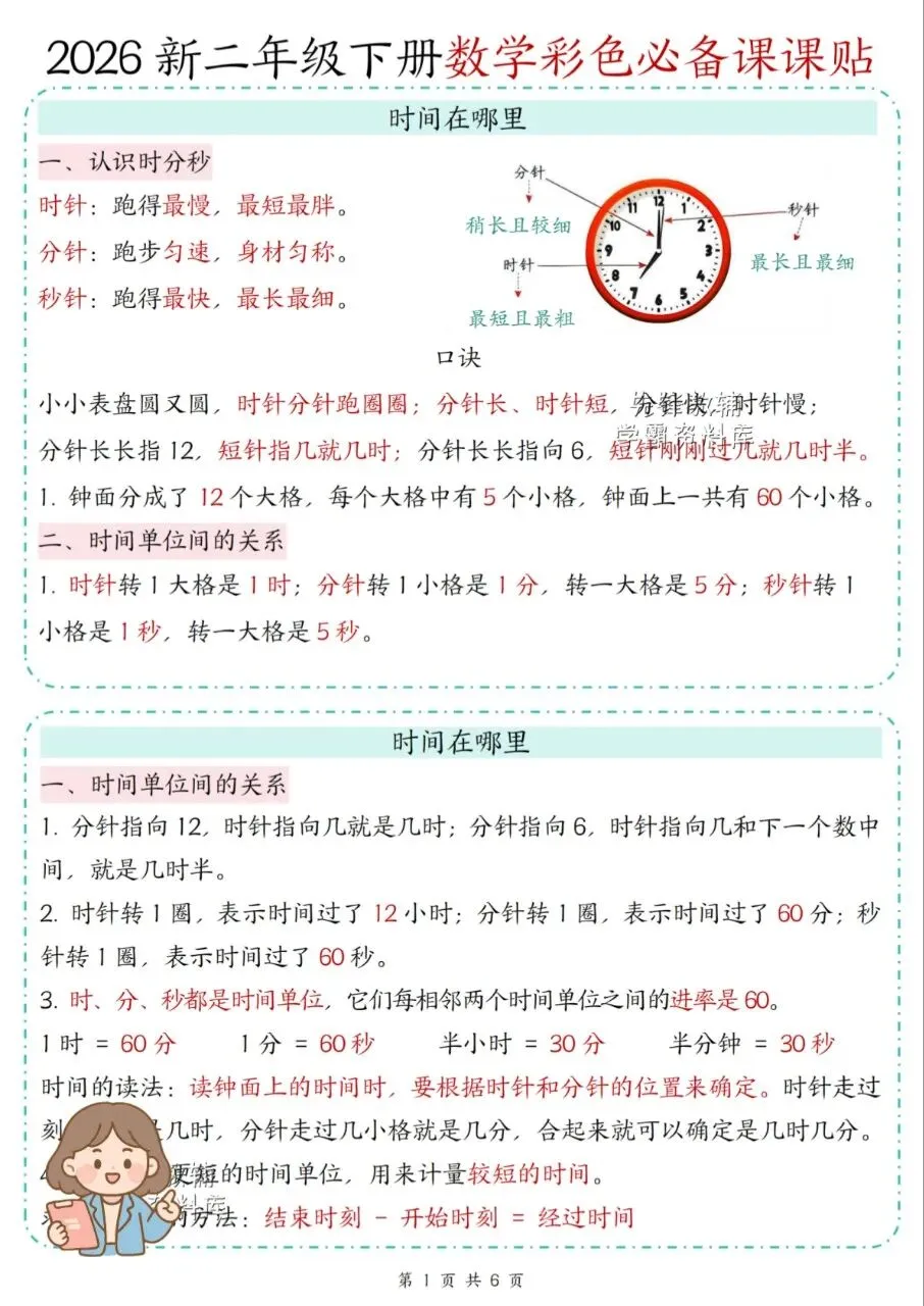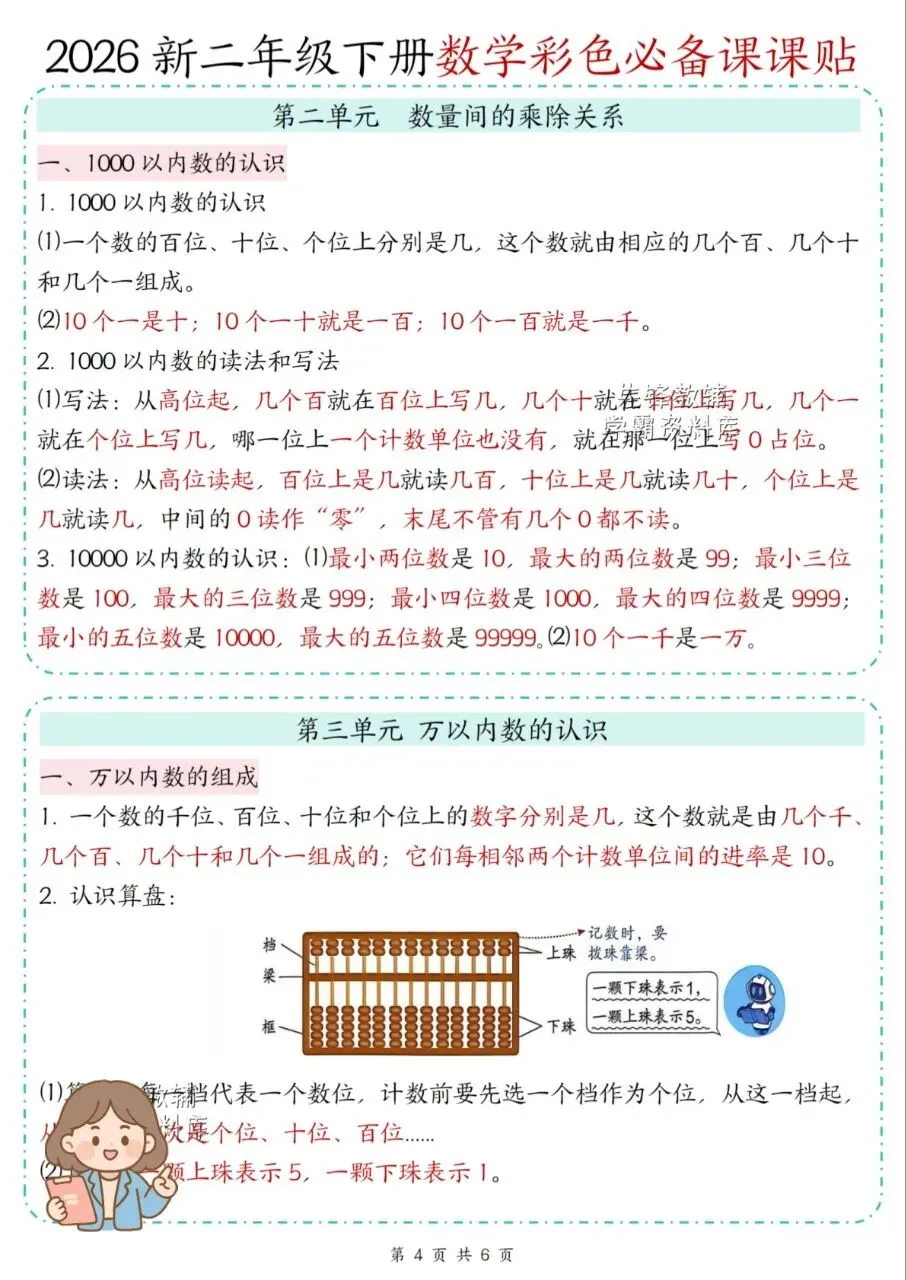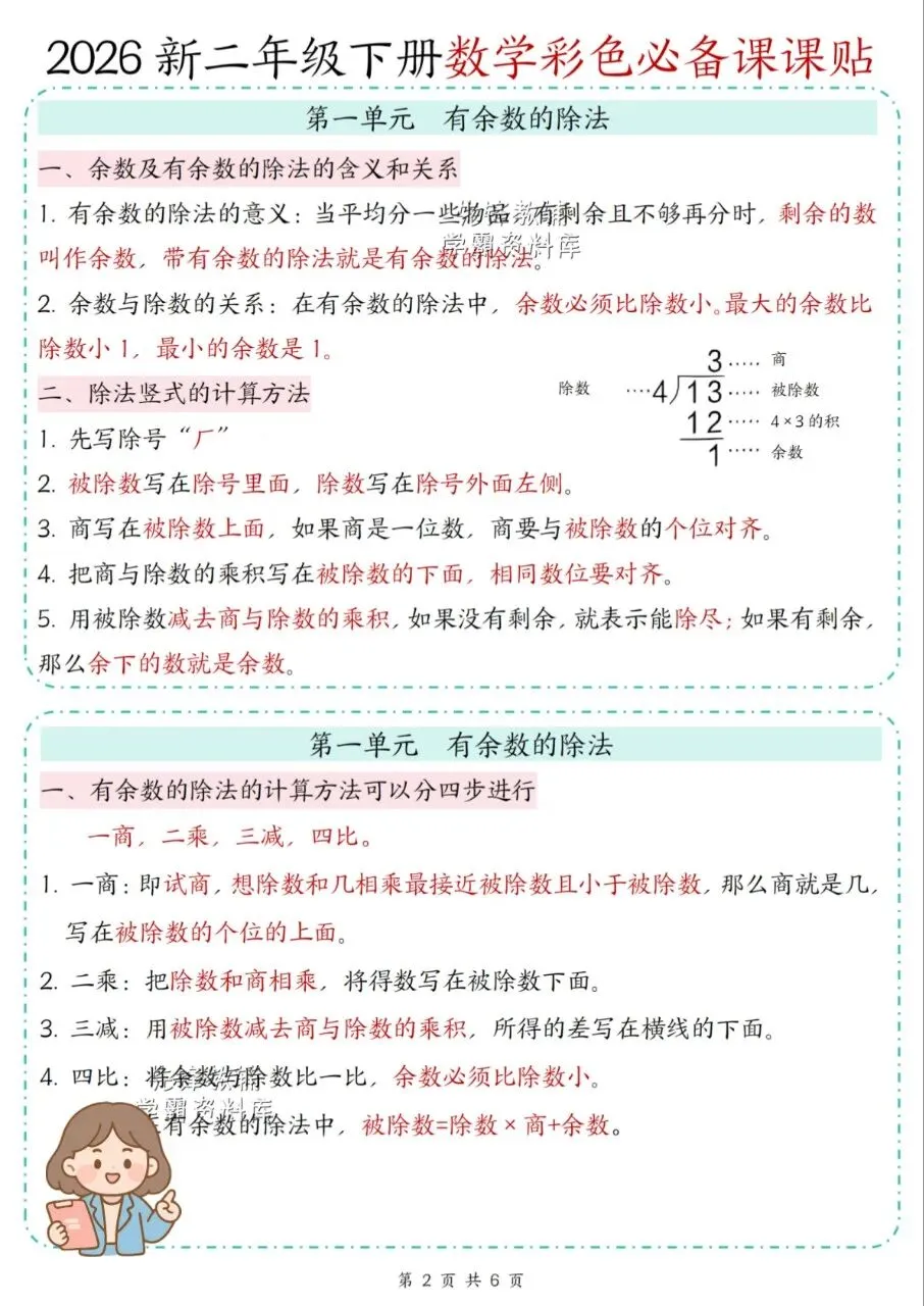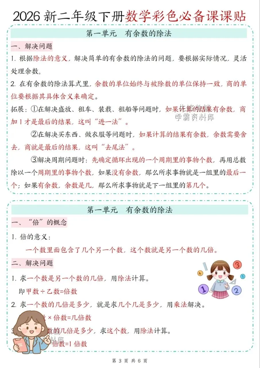 这份二年级下册数学课课贴分单元梳理事点,配口诀、公式和解题方法,讲练结合,重难点清晰,适配低年级数学学习,易记好用。推荐给孩子备上。