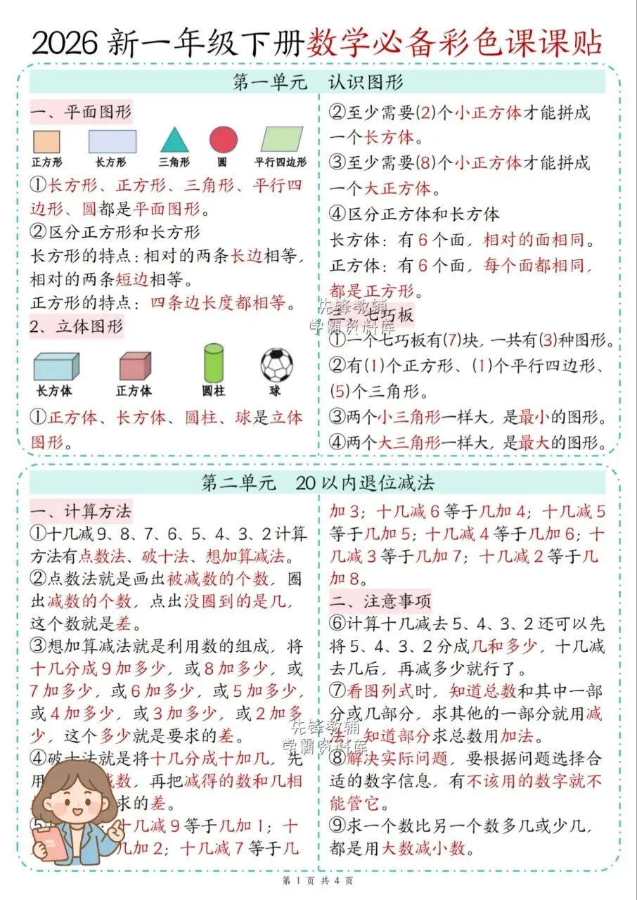 这份一年级下册数学课课贴知识点全覆盖,分单元梳理清晰,口诀+技巧易记,贴合考点且标注重点,适配低年级学习需求。推荐给孩子备上。
