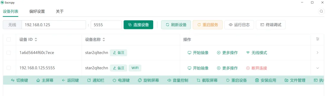 只要你的手机和电脑连在同一个WiFi下,就能在Escrcpy里一键开启「无线模式」,记下手机的IP地址。