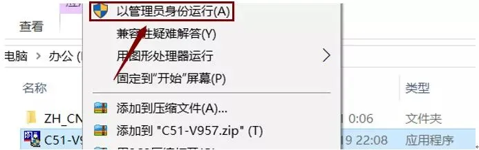 3. 选中“C51-V957”可执行文件,选择“以管理员身份运行”。