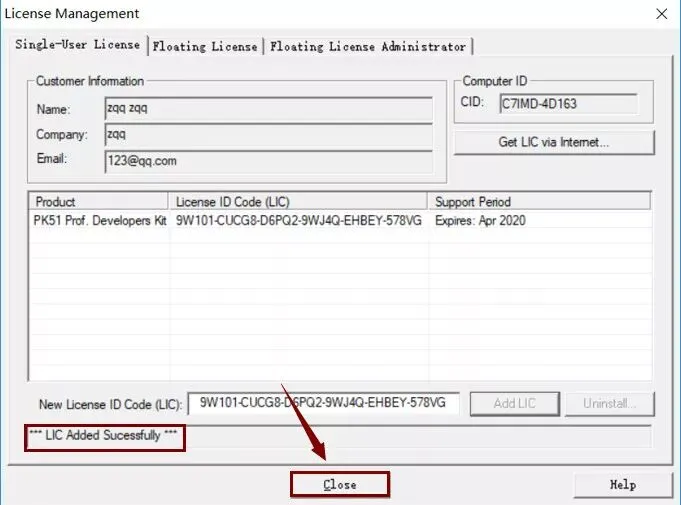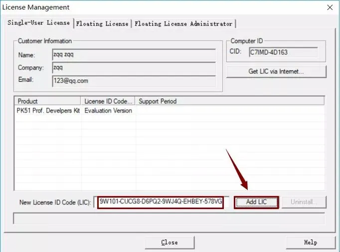 16. 在“NewLicense ID Code”框里粘贴注册码,然后点击“Add LIC”。