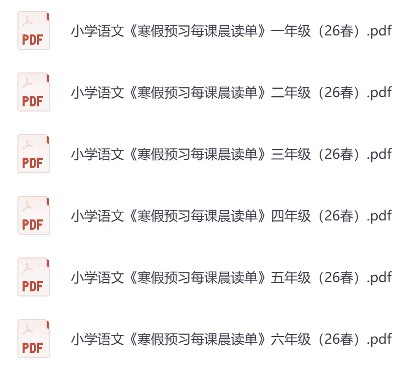 这套资源覆盖了1-6年级下册的语文学习内容,核心是**《每课预习晨读单》**,非常适合作为寒假语文预习作业。每天坚持晨读,不仅能有效培养语感,还能积累丰富的写作素材,为开学后的学习打下坚实基础。