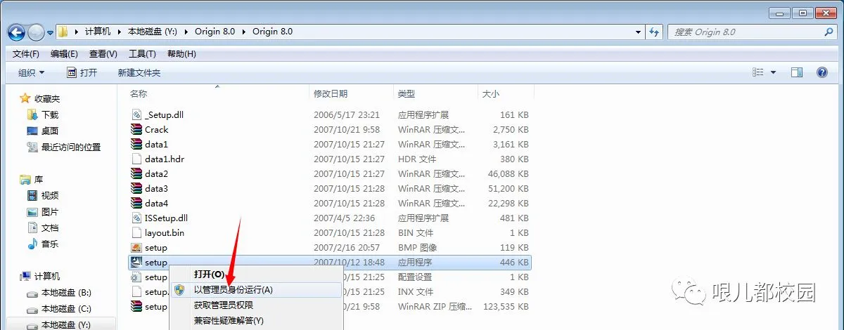 2.打开“Origin 8.0\Origin 8.0”文件夹,鼠标右击“setup”,选择“以管理员身份运行”