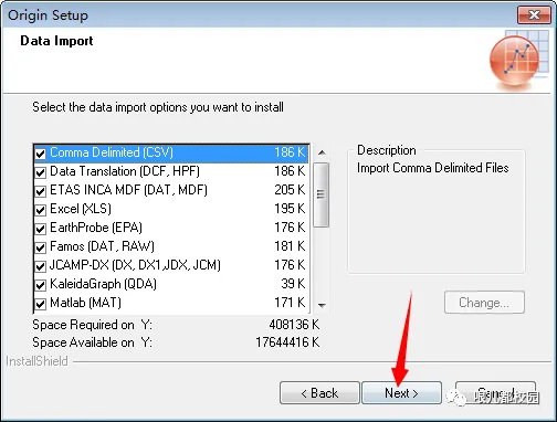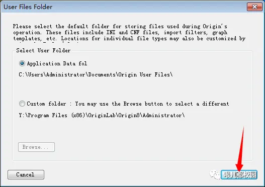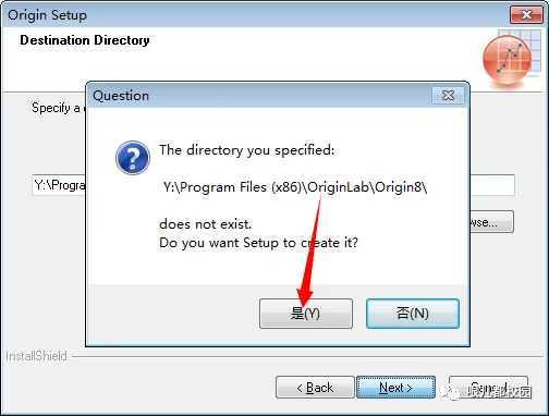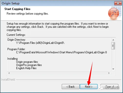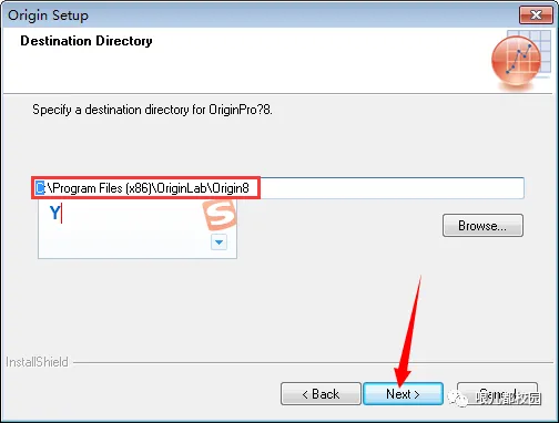 8.选择安装目录,默认安装在 C:\Program Files (x86)\OriginLab\Origin8(建议安装在除C盘以外的磁盘上,可以直接将C改成Y,安装到Y盘),然后点击“Next”