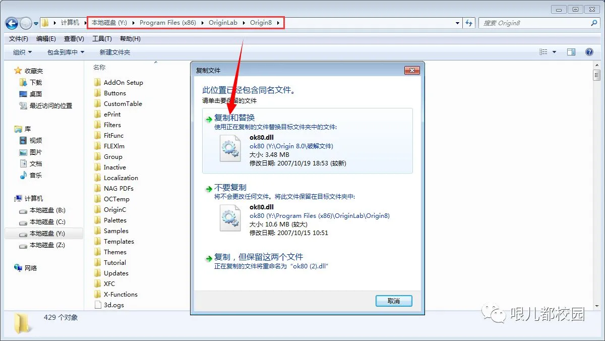19.打开安装路径(默认为 C:\Program Files (x86)\OriginLab\Origin8)文件夹,粘贴刚刚复制的文件“ok80.dll”,然后点击“复制和替换”
